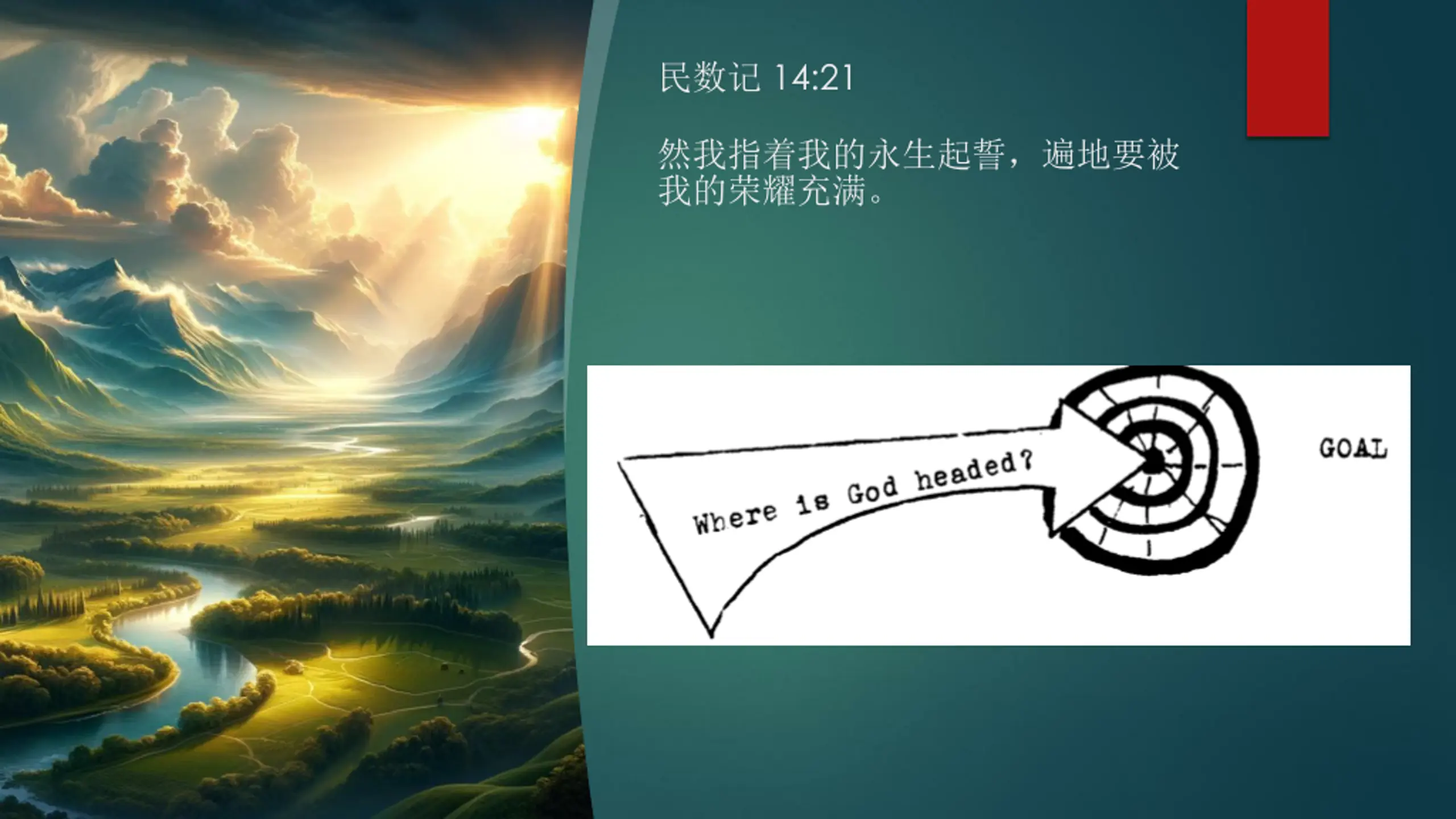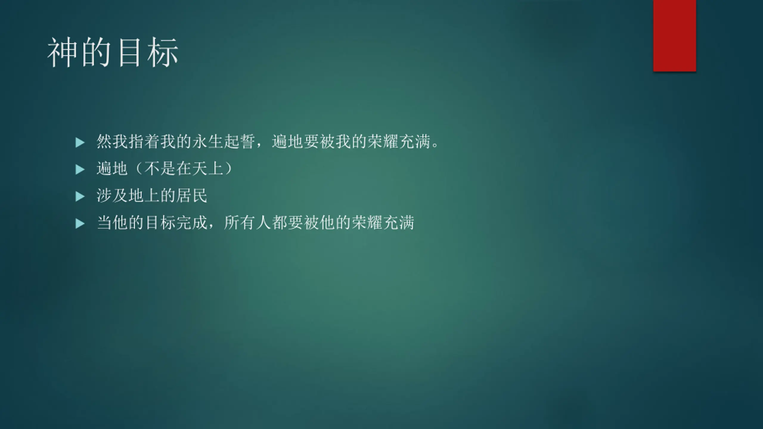 神的目标 然我指着我的永生起誓,遍地要被我的荣耀充满。 遍地(不是在天上) 涉及地上的居民 当他的目标完成,所有人都要被他的荣耀充满