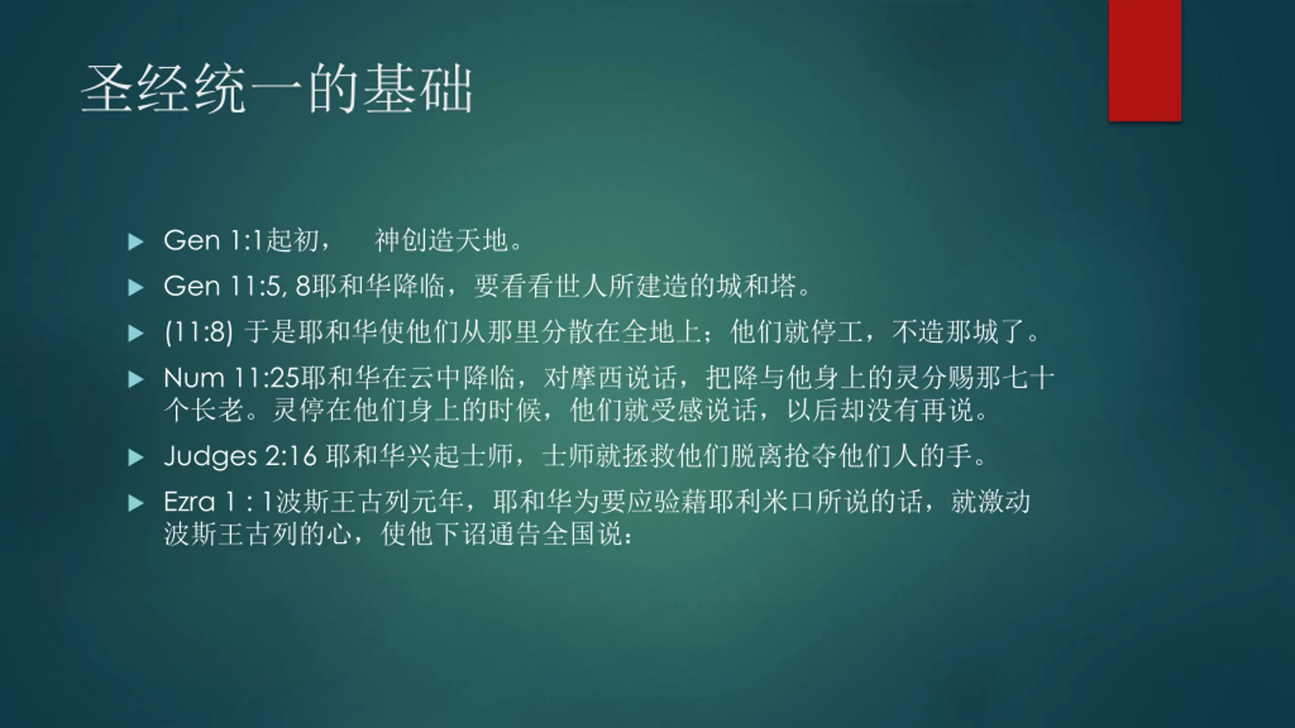 圣经统一的基础 Gen 1:1起初, 神创造天地。 Gen 11:5, 8耶和华降临,要看看世人所建造的城和塔。 (11:8) 于是耶和华使他们从那里分散在全地上;他们就停工,不造那城了。 Num 11:25耶和华在云中降临,对摩西说话,把降与他身上的灵分赐那七十 个长老。灵停在他们身上的时候,他们就受感说话,以后却没有再说。 Judges 2:16 耶和华兴起士师,士师就拯救他们脱离抢夺他们人的手。 Ezra 1 : 1波斯王古列元年,耶和华为要应验藉耶利米口所说的话,就激动 波斯王古列的心,使他下诏通告全国说: