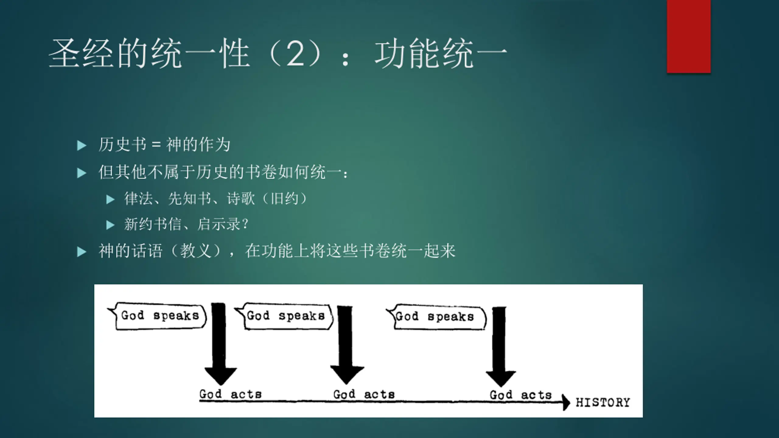 圣经的统一性(2):功能统一 历史书 = 神的作为 但其他不属于历史的书卷如何统一: 律法、先知书、诗歌(旧约) 新约书信、启示录? 神的话语(教义),在功能上将这些书卷统一起来