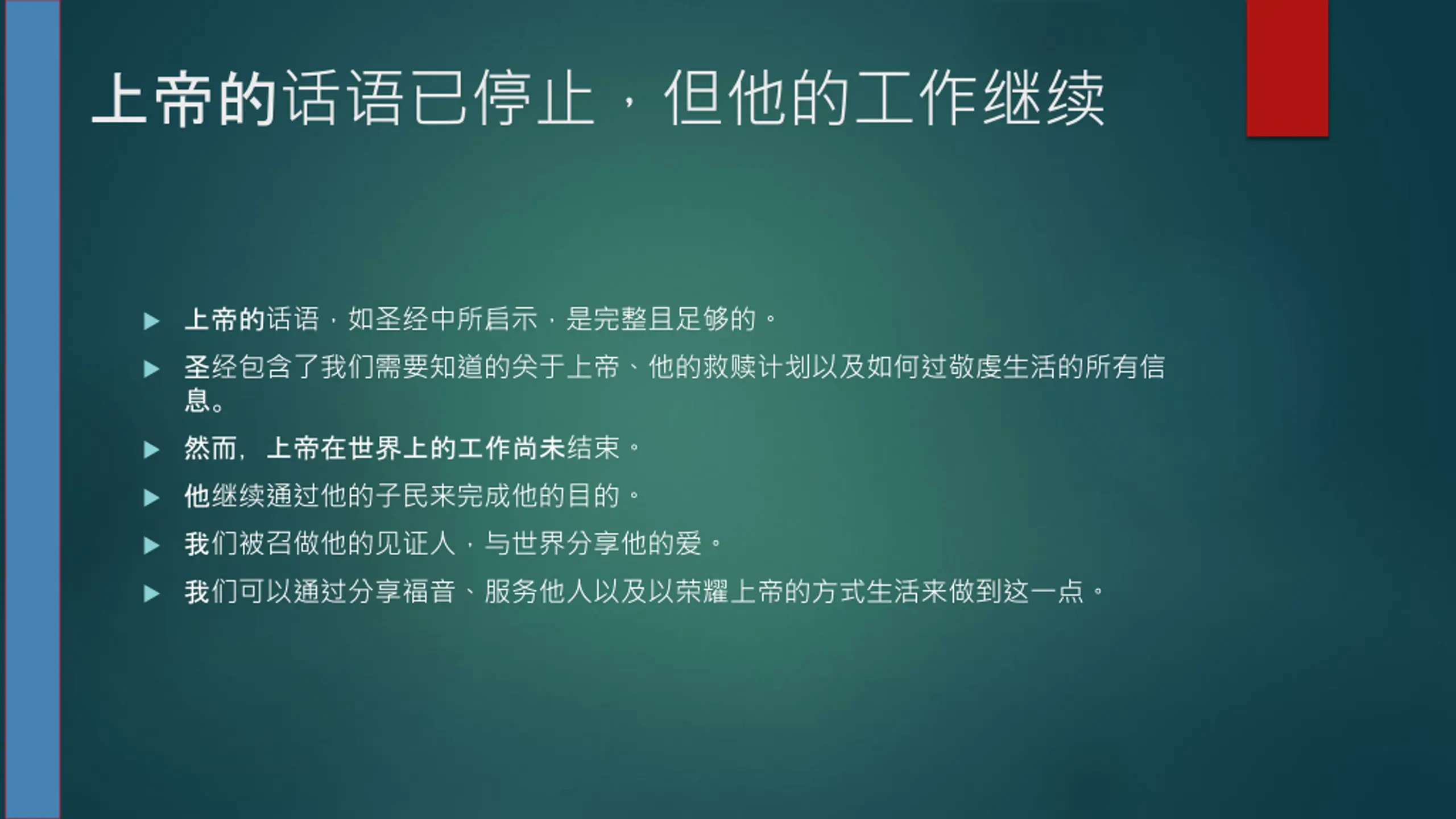 上帝的话语已停止,但他的工作继续 上帝的话语,如圣经中所启示,是完整且足够的。 圣经包含了我们需要知道的关于上帝、他的救赎计划以及如何过敬虔生活的所有信 息。 然而,上帝在世界上的工作尚未结束。 他继续通过他的子民来完成他的目的。 我们被召做他的见证人,与世界分享他的爱。 我们可以通过分享福音、服务他人以及以荣耀上帝的方式生活来做到这一点。