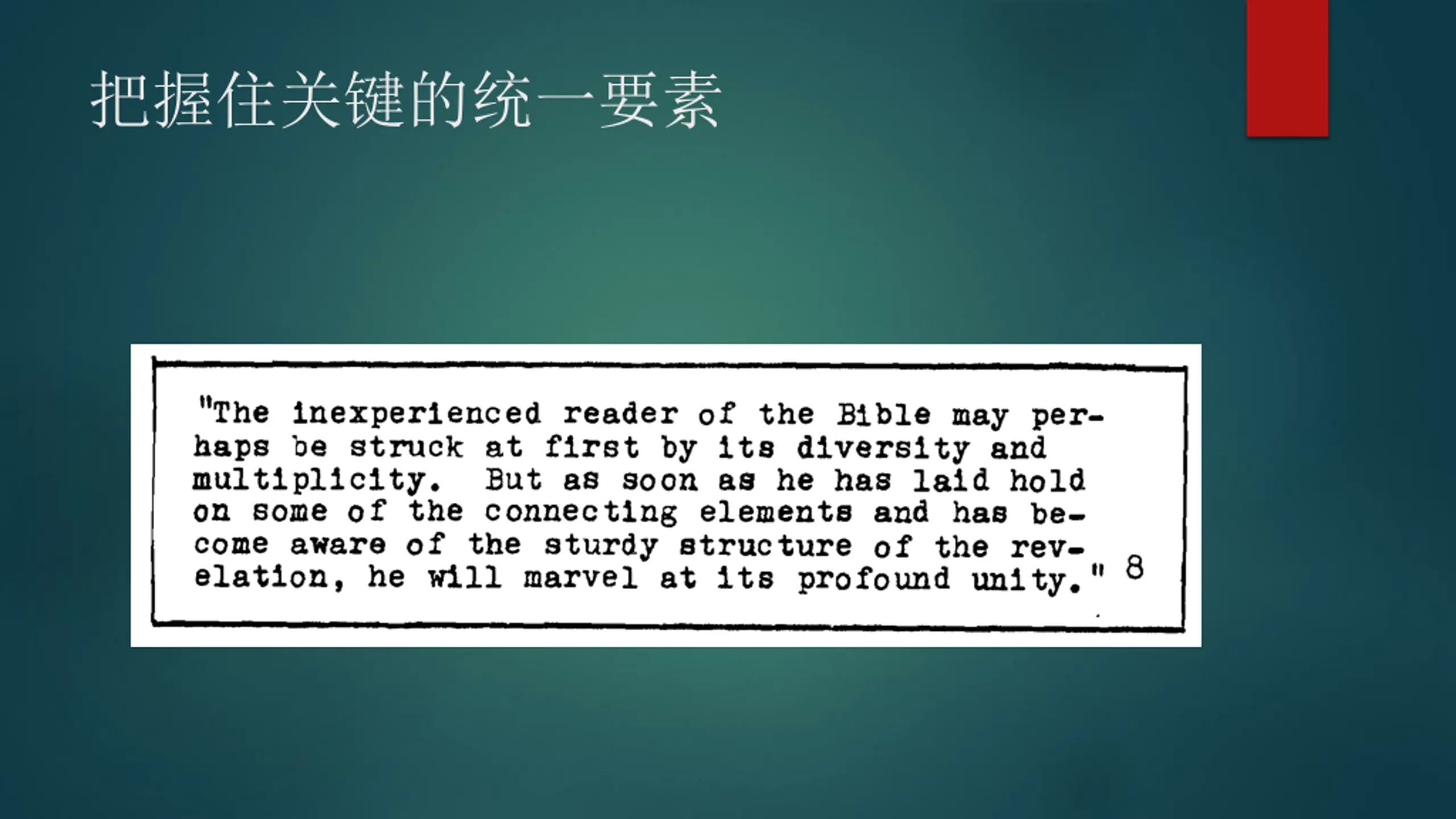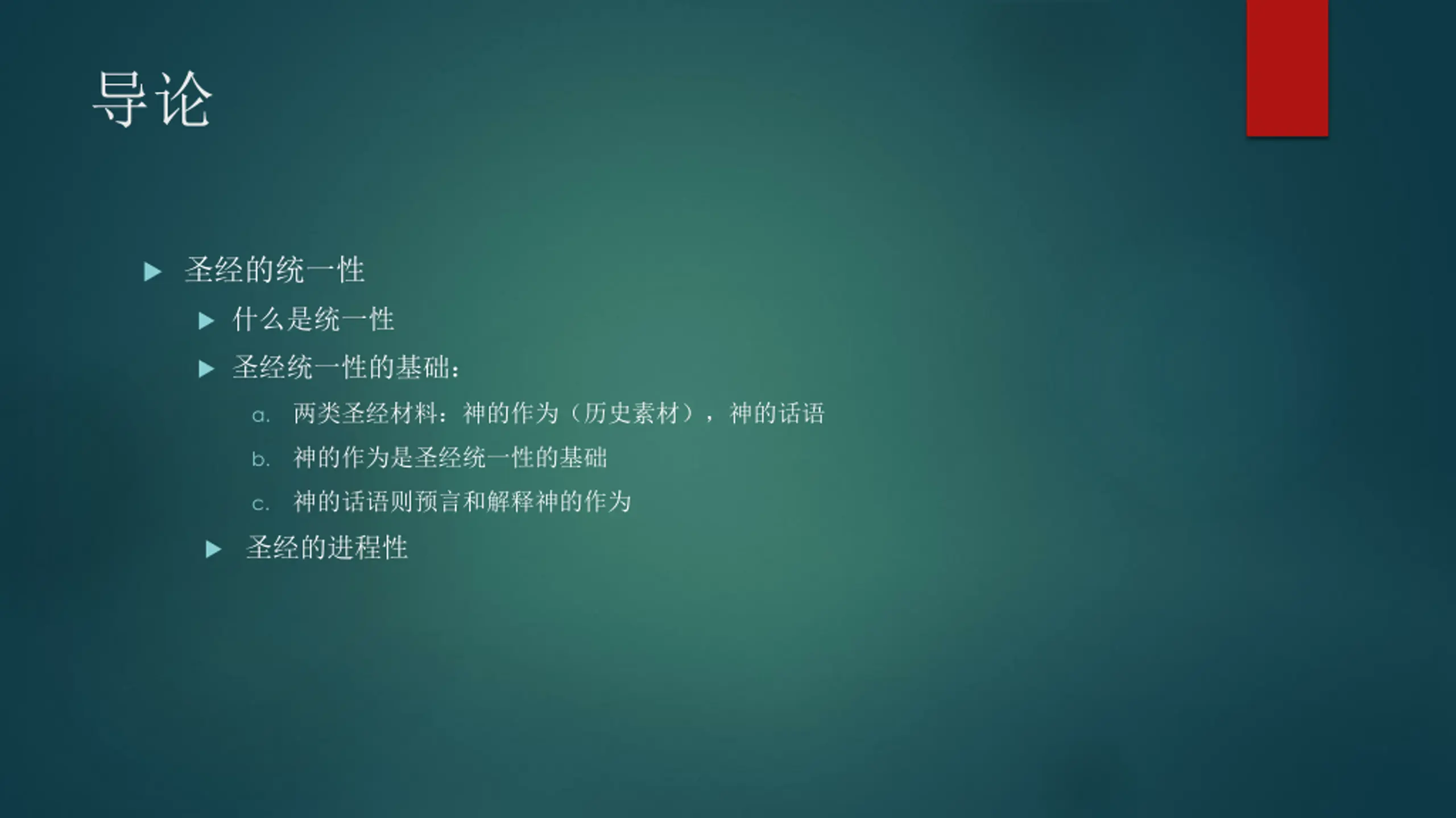 导论 圣经的统一性 什么是统一性 圣经统一性的基础: 两类圣经材料:神的作为(历史素材),神的话语 a. 神的作为是圣经统一性的基础 b. 神的话语则预言和解释神的作为 c. 圣经的进程性