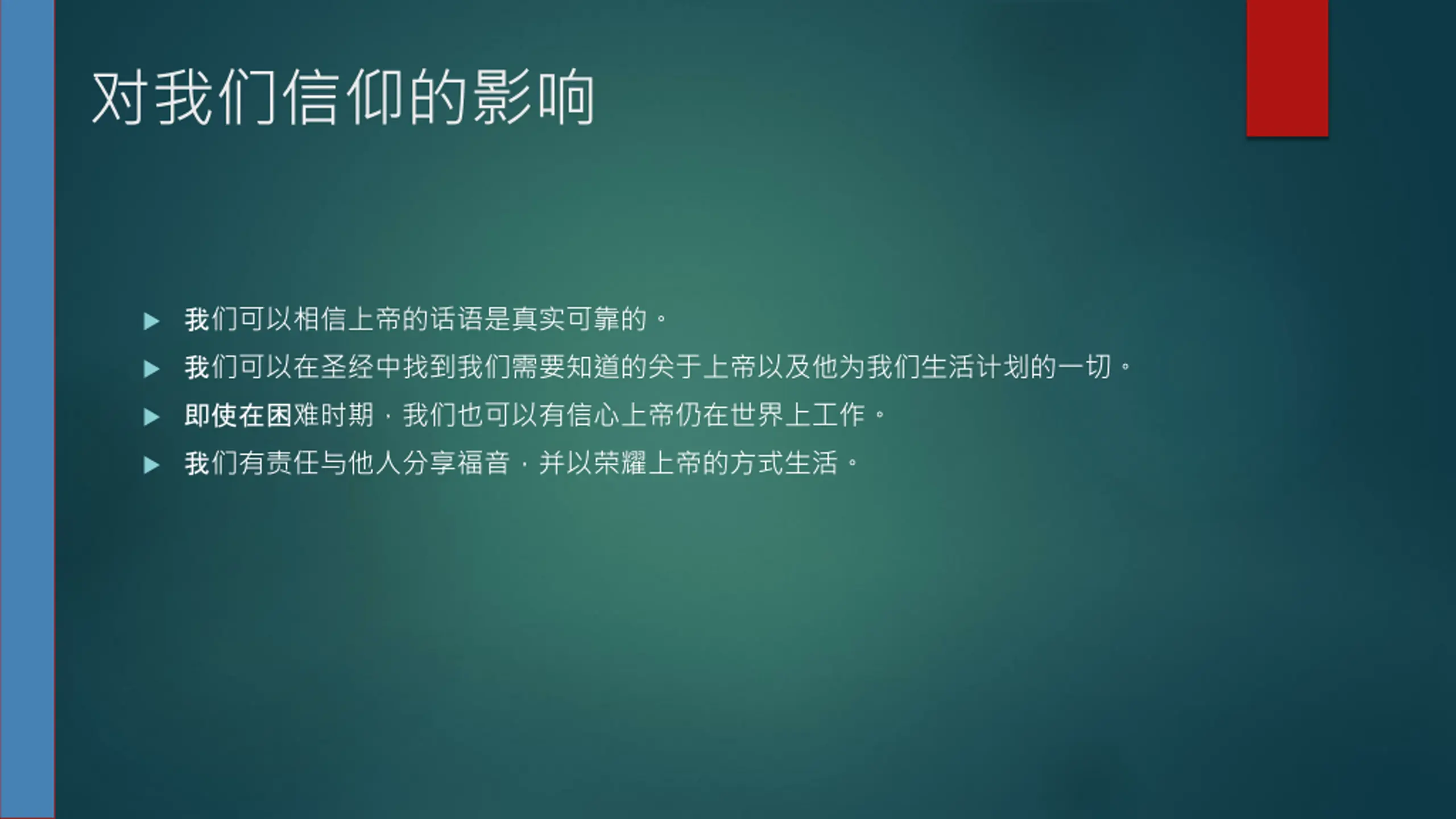 对我们信仰的影响 我们可以相信上帝的话语是真实可靠的。 我们可以在圣经中找到我们需要知道的关于上帝以及他为我们生活计划的一切。 即使在困难时期,我们也可以有信心上帝仍在世界上工作。 我们有责任与他人分享福音,并以荣耀上帝的方式生活。