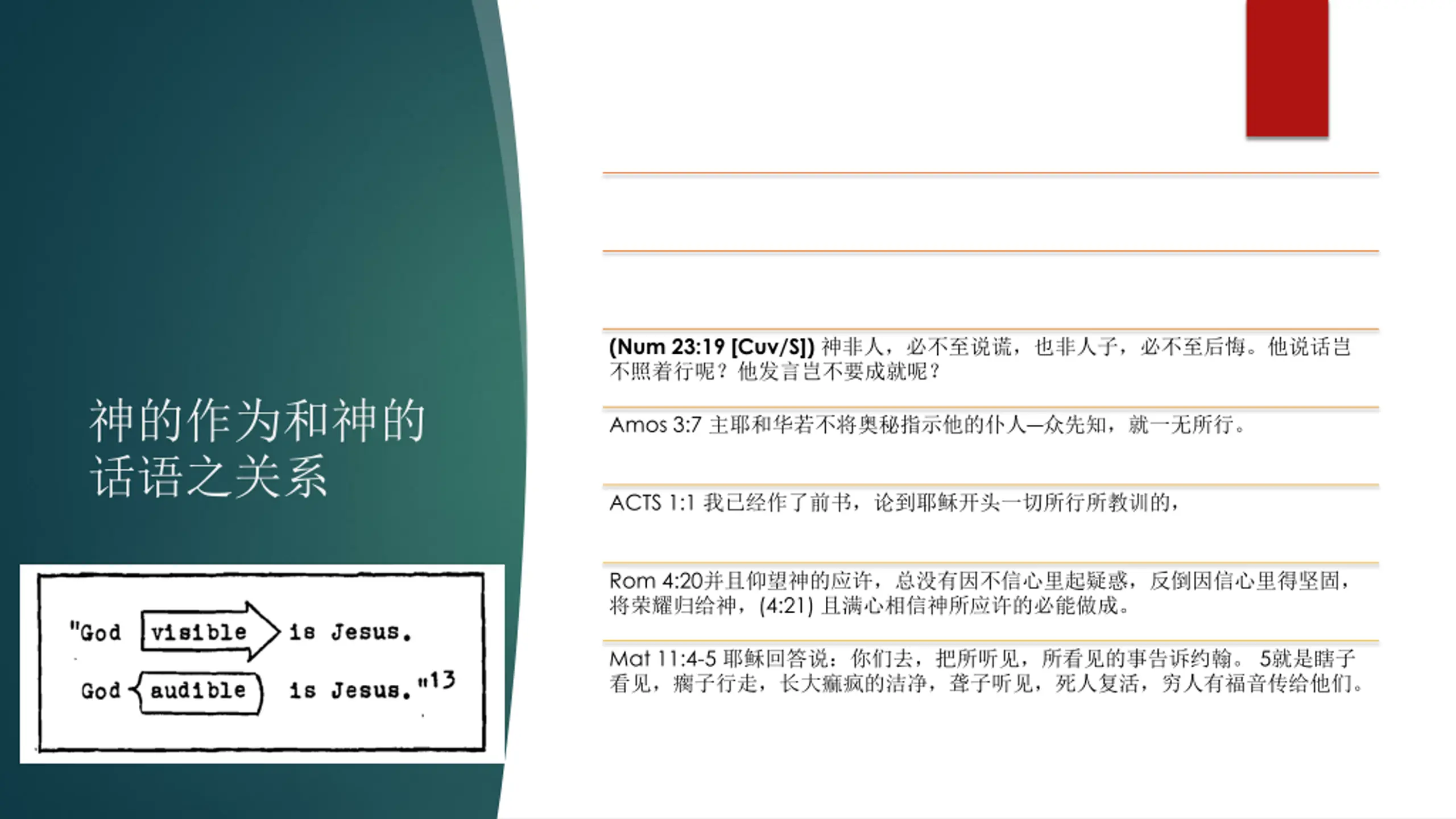 神不会一言不发,单独采取任何行动 神的行动绝不会与其话语矛盾冲突 (Num 23:19 [Cuv/S]) 神非人,必不至说谎,也非人子,必不至后悔。他说话岂 不照着行呢?他发言岂不要成就呢? 神的作为和神的 话语之关系 Amos 3:7 主耶和华若不将奥秘指示他的仆人―众先知,就一无所行。 ACTS 1:1 我已经作了前书,论到耶稣开头一切所行所教训的, Rom 4:20并且仰望神的应许,总没有因不信心里起疑惑,反倒因信心里得坚固, 将荣耀归给神,(4:21) 且满心相信神所应许的必能做成。 Mat 11:4-5 耶稣回答说:你们去,把所听见,所看见的事告诉约翰。 5就是瞎子 看见,瘸子行走,长大痲疯的洁净,聋子听见,死人复活,穷人有福音传给他们。