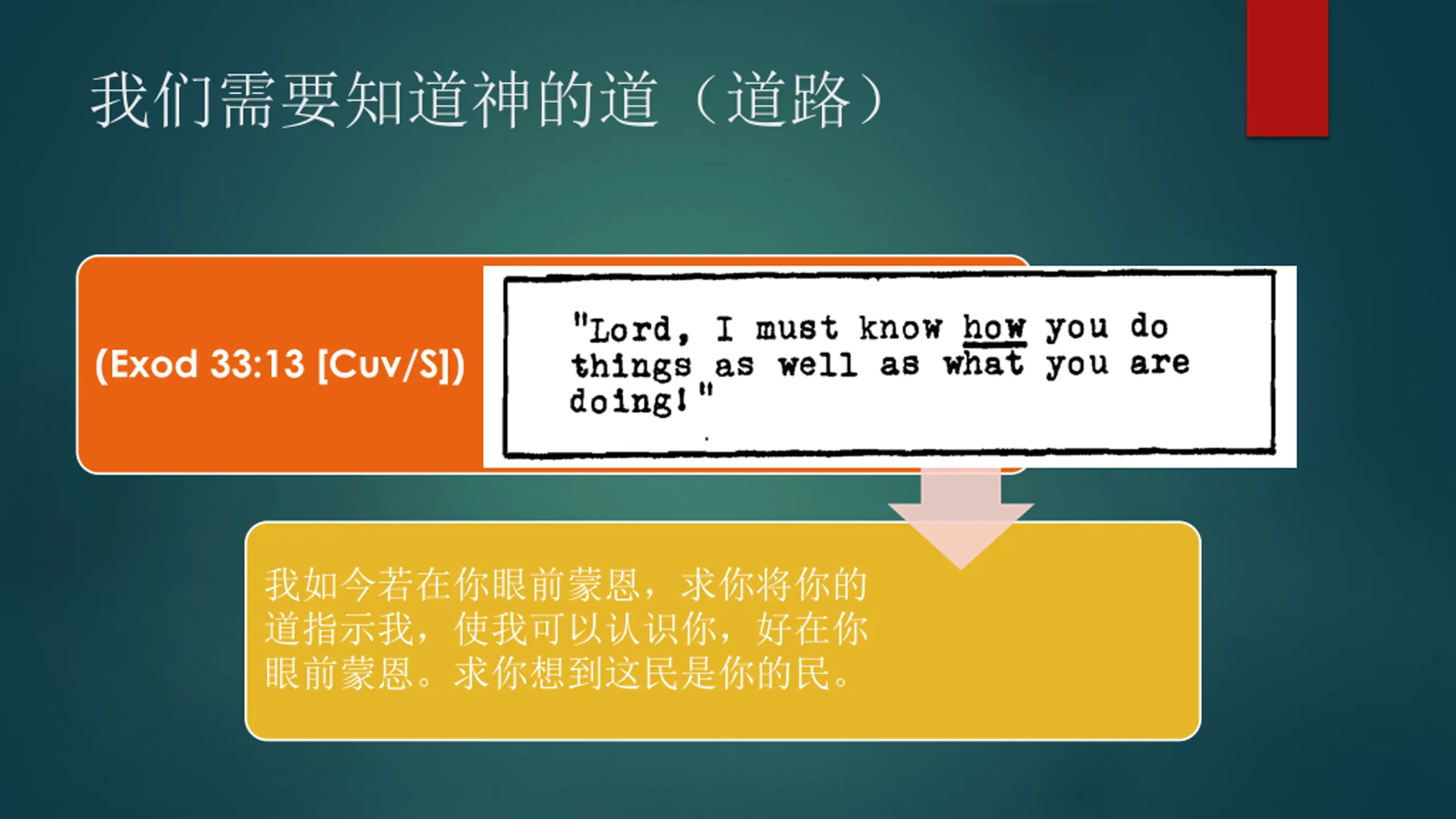 我们需要知道神的道(道路) (Exod 33:13 [Cuv/S]) 我如今若在你眼前蒙恩,求你将你的 道指示我,使我可以认识你,好在你 眼前蒙恩。求你想到这民是你的民。