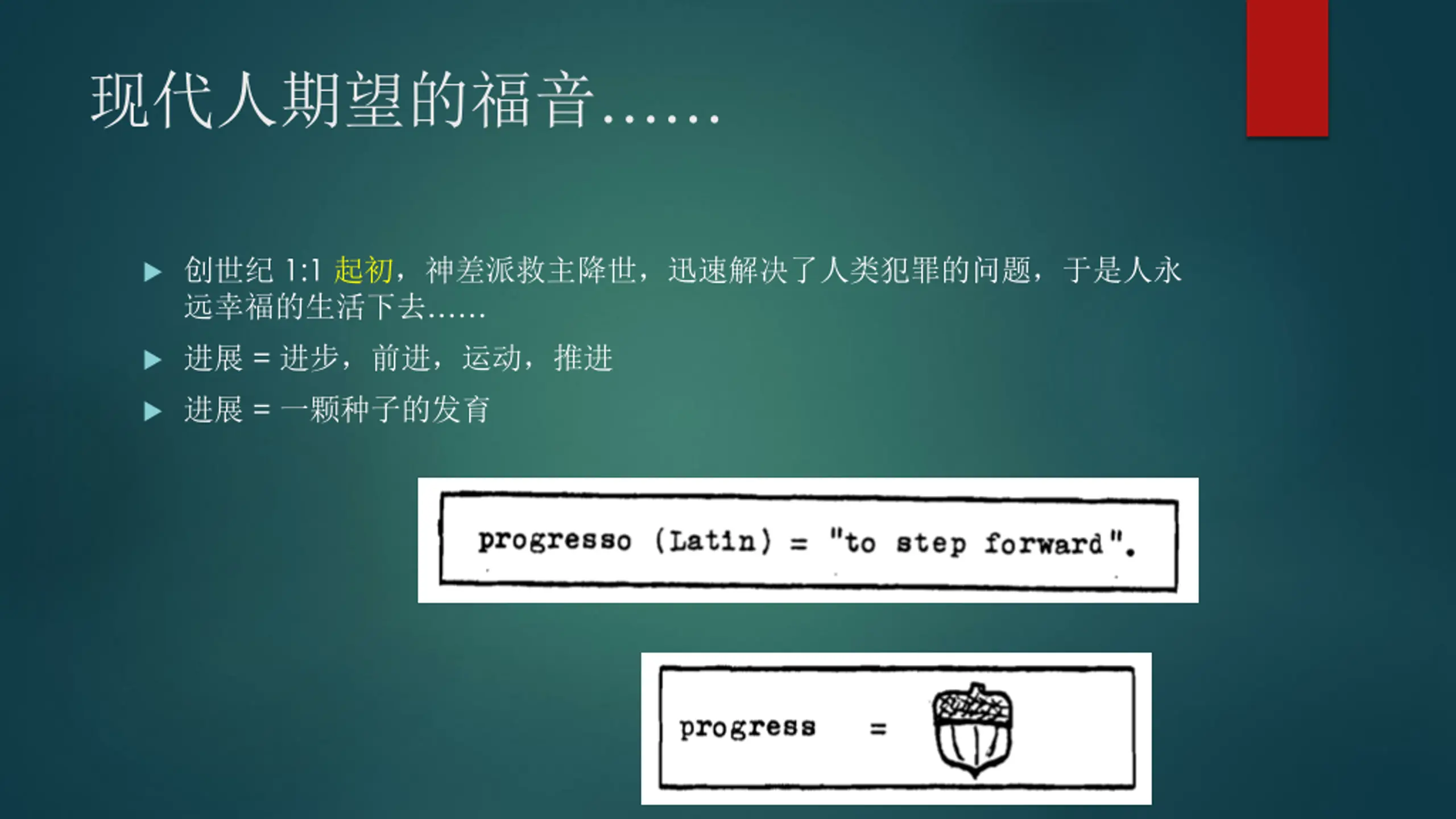 现代人期望的福音…… 创世纪 1:1 起初,神差派救主降世,迅速解决了人类犯罪的问题,于是人永 远幸福的生活下去…… 进展 = 进步,前进,运动,推进 进展 = 一颗种子的发育