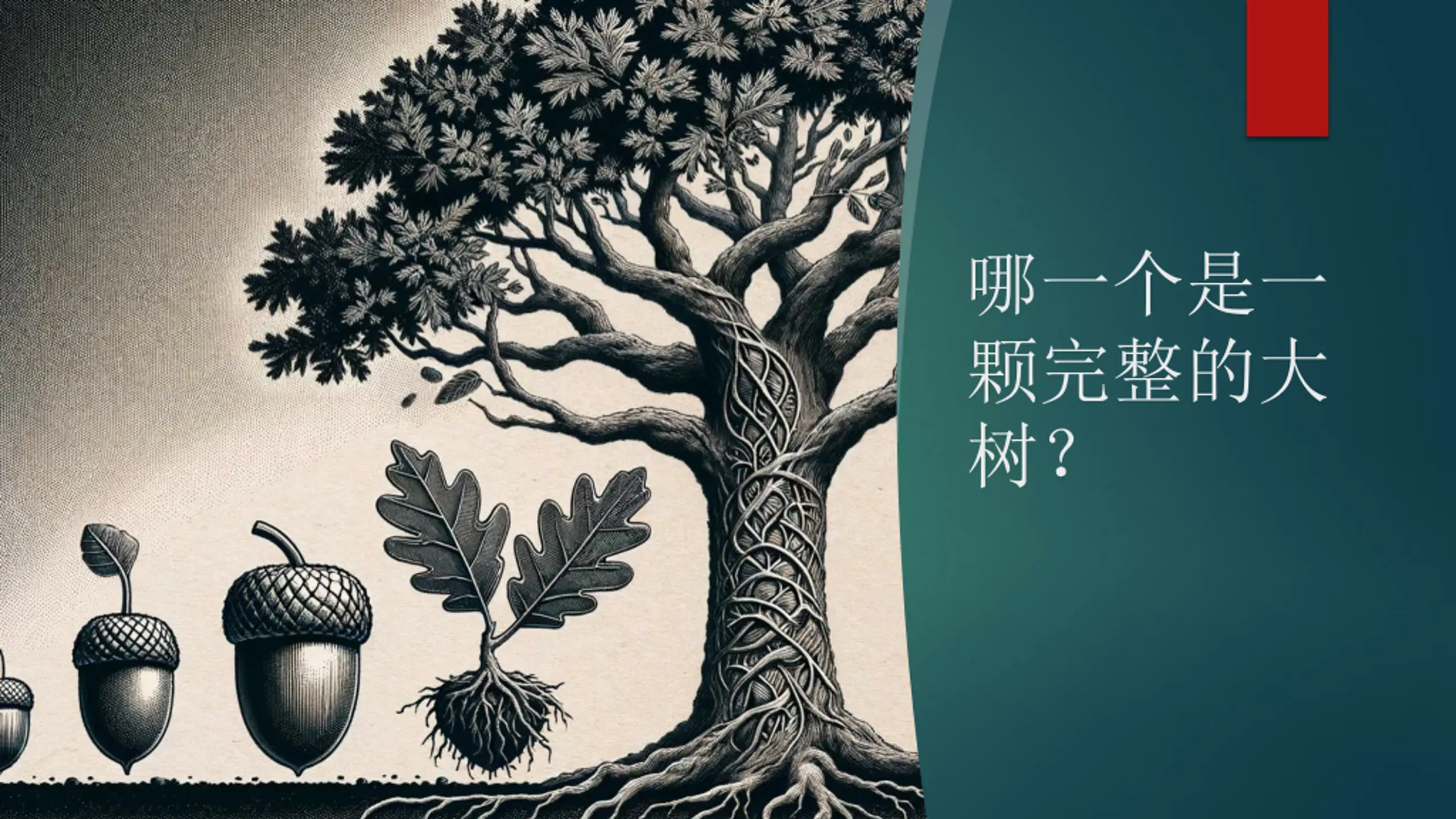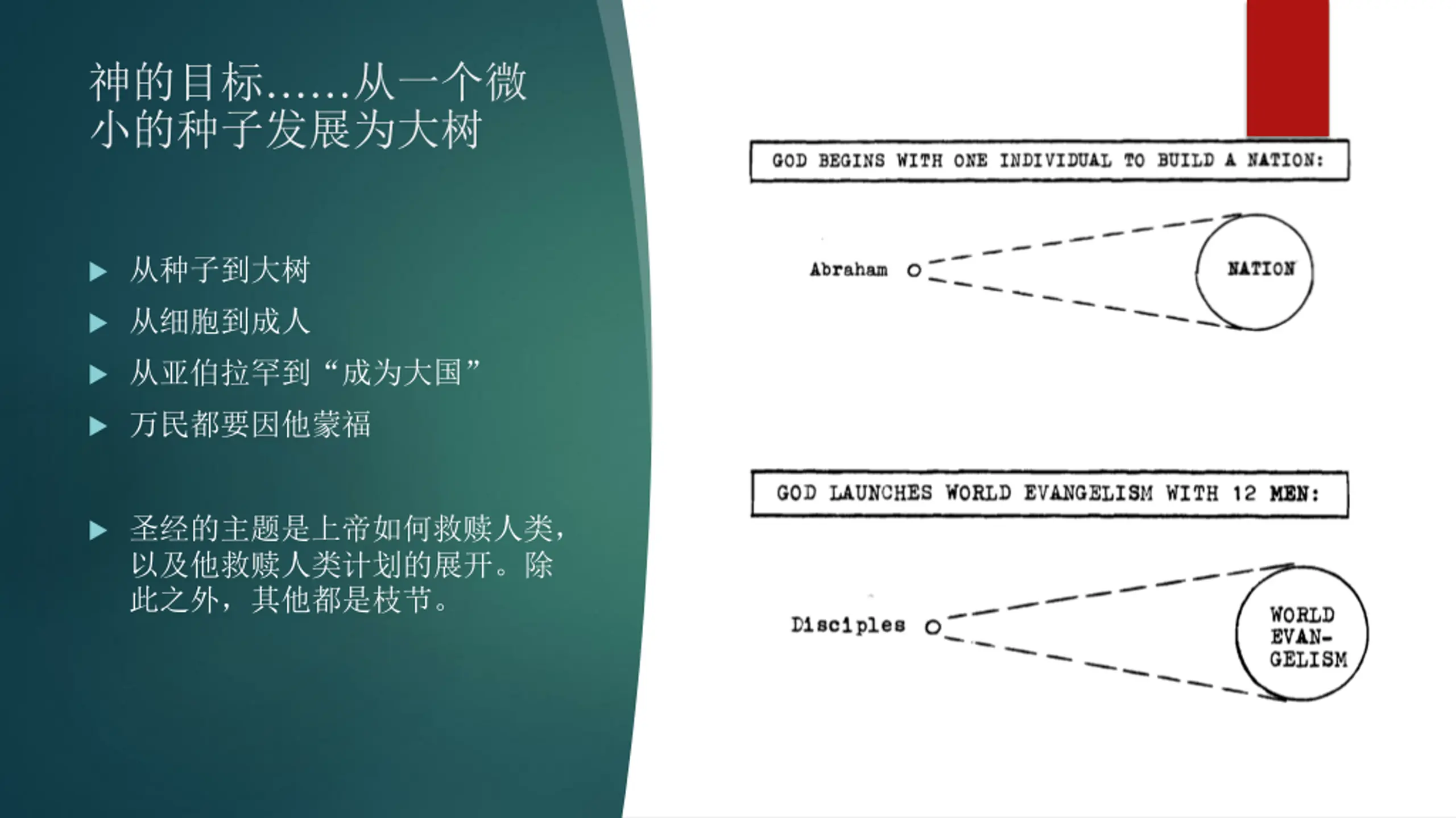 神的目标……从一个微 小的种子发展为大树 从种子到大树 从细胞到成人 从亚伯拉罕到“成为大国” 万民都要因他蒙福 圣经的主题是上帝如何救赎人类, 以及他救赎人类计划的展开。除 此之外,其他都是枝节。