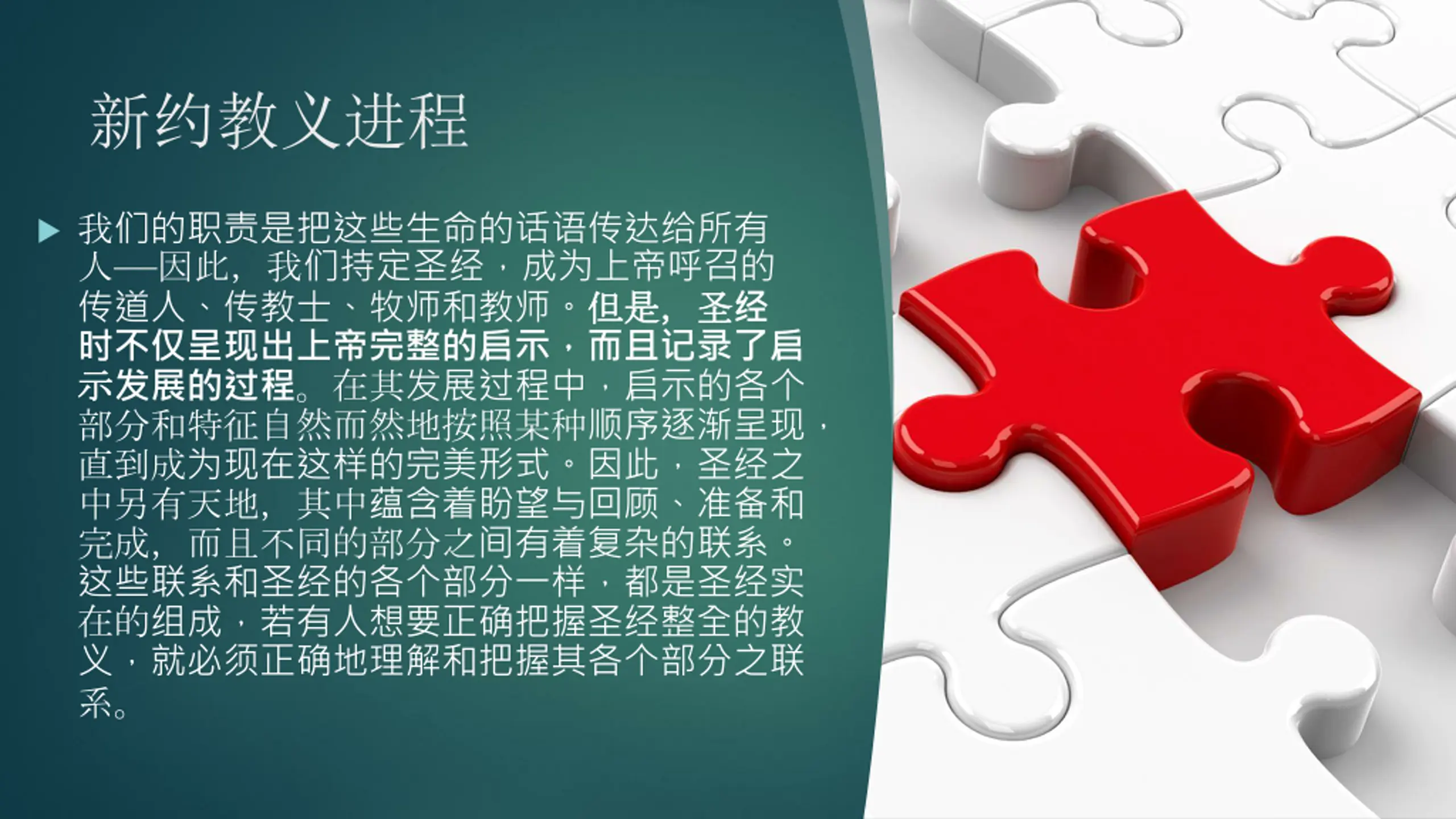 新约教义进程 我们的职责是把这些生命的话语传达给所有 人——因此,我们持定圣经,成为上帝呼召的 传道人、传教士、牧师和教师。但是,圣 时不仅呈现出上帝完整的启示,而且记录了启 示 示发展的过程。在其发展过程中,启示的各个 部分和特征自然而然地按照某种顺序逐渐呈现, 直到成为现在这样的完美形式。因此,圣经之 中另有天地,其中蕴含着盼望与回顾、准备和 完成,而且不同的部分之间有着复杂的联系。 这些联系和圣经的各个部分一样,都是圣经实 在的组成,若有人想要正确把握圣经整全的教 义,就必须正确地理解和把握其各个部分之联 系。 但是,圣经