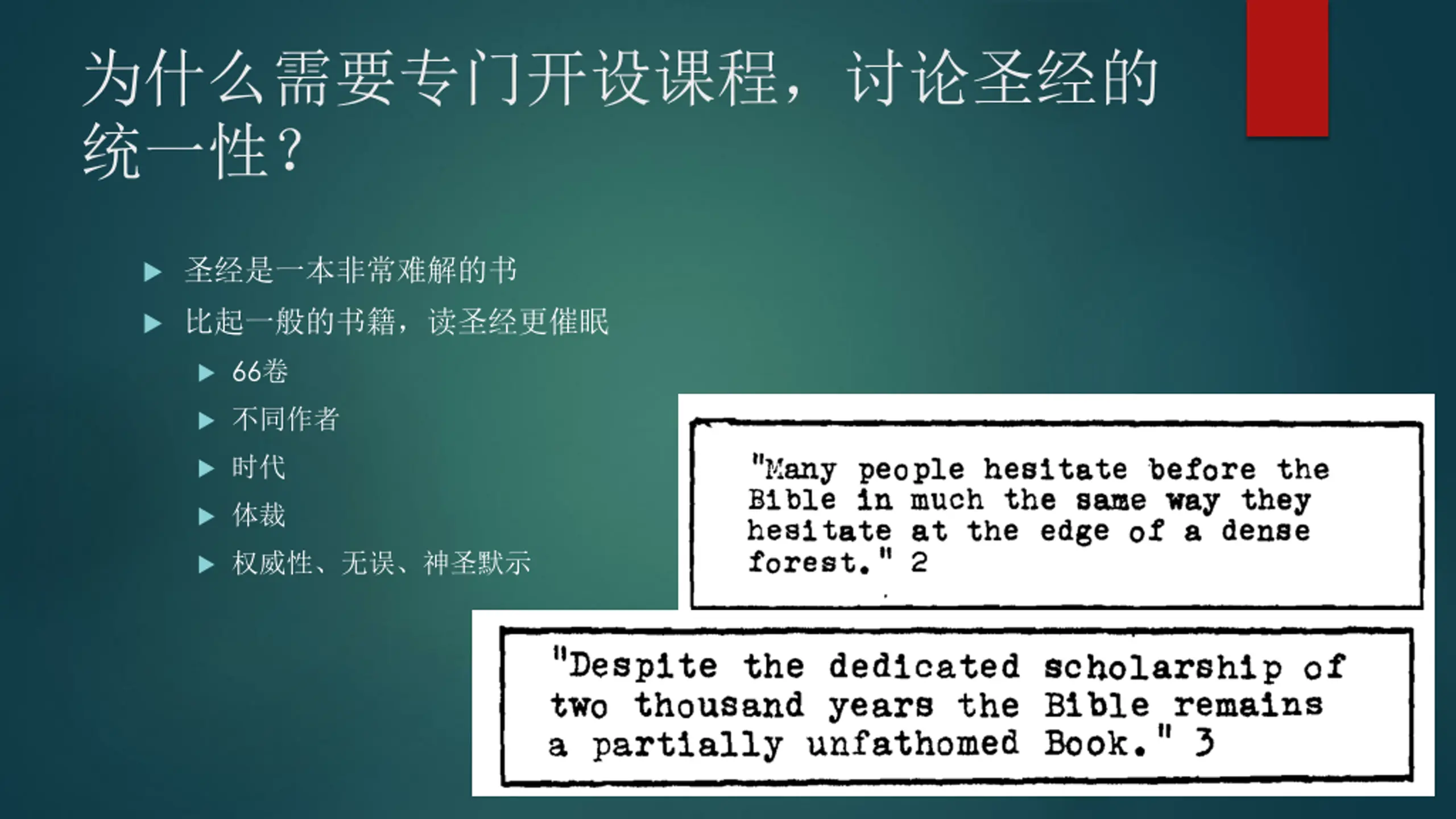 为什么需要专门开设课程,讨论圣经的 统一性? 圣经是一本非常难解的书 比起一般的书籍,读圣经更催眠 66卷 不同作者 时代 体裁 权威性、无误、神圣默示