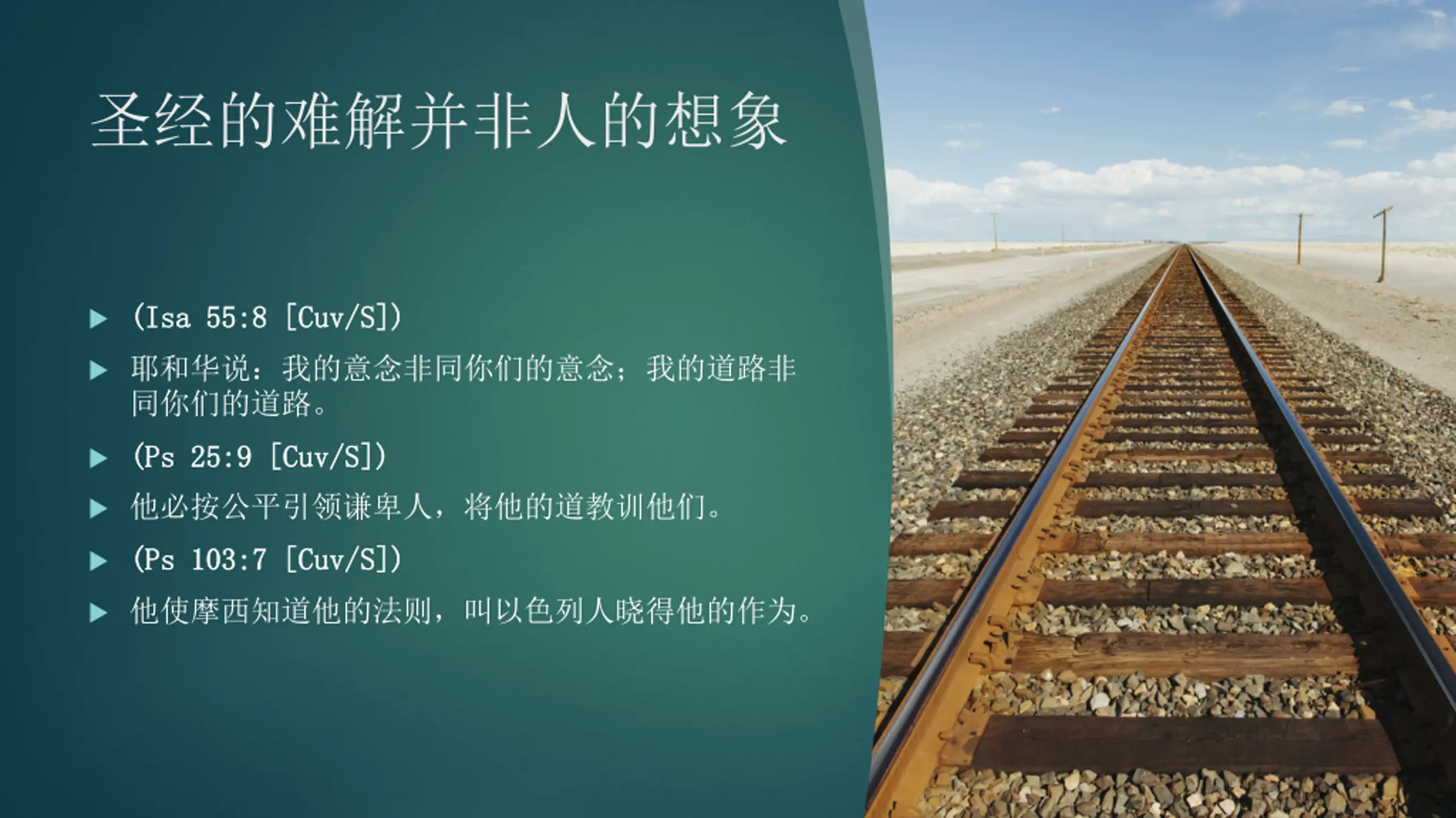 圣经的难解并非人的想象 (Isa 55:8 [ (Isa 55:8 [Cuv Cuv/S]) /S]) 耶和华说:我的意念非同你们的意念;我的道路非 同你们的道路。 (Ps 25:9 [ (Ps 25:9 [Cuv Cuv/S]) /S]) 他必按公平引领谦卑人,将他的道教训他们。 (Ps 103:7 [ (Ps 103:7 [Cuv Cuv/S]) /S]) 他使摩西知道他的法则,叫以色列人晓得他的作为。