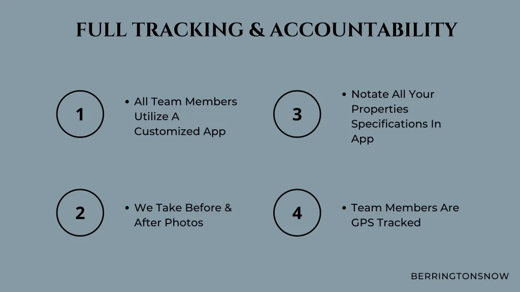 FULL TRACKING & ACCOUNTABILITY Notate All Your Properties Specifications In App All Team Members Utilize A Customized App We Take Before & After Photos Team Members Are GPS Tracked BERRINGTONSNOW