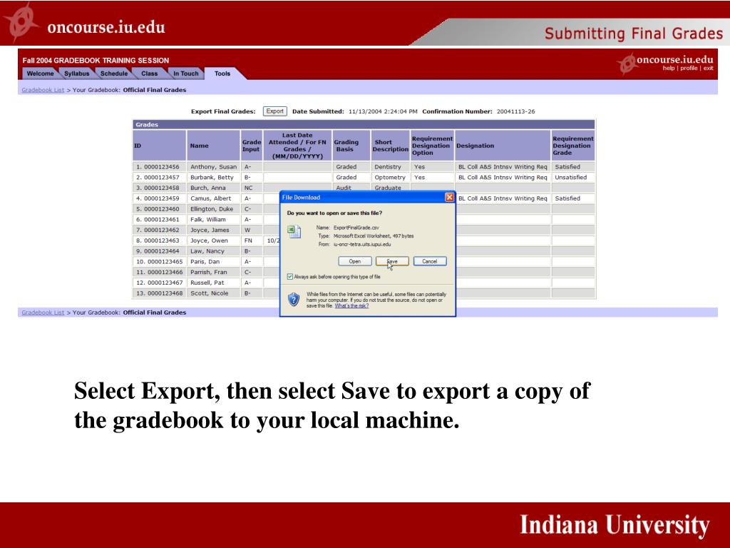 Select Export, then select Save to export a copy of the gradebook to your local machine.