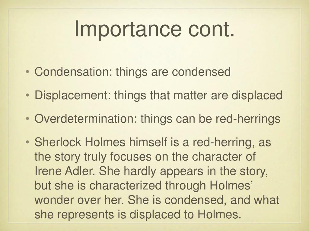 Importance cont. • Condensation: things are condensed • Displacement: things that matter are displaced • Overdetermination: things can be red-herrings • Sherlock Holmes himself is a red-herring, as the story truly focuses on the character of Irene Adler. She hardly appears in the story, but she is characterized through Holmes’ wonder over her. She is condensed, and what she represents is displaced to Holmes.