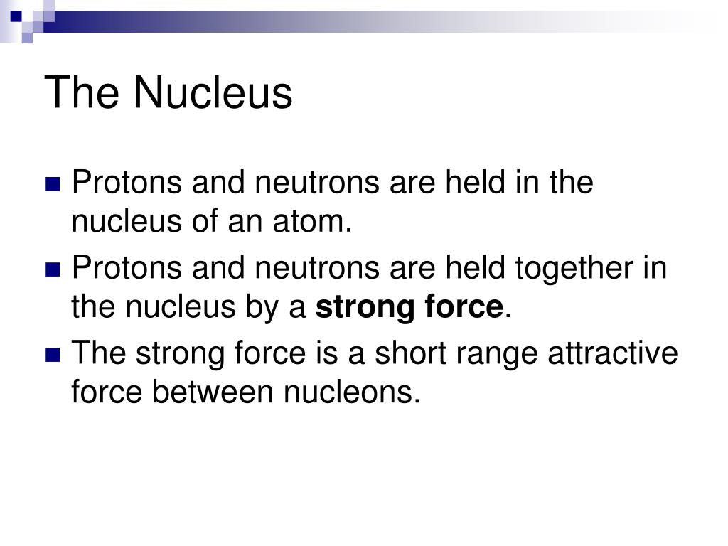 The Nucleus • Protons and neutrons are held in the nucleus of an atom. • Protons and neutrons are held together in the nucleus by a strong force. • The strong force is a short range attractive force between nucleons.