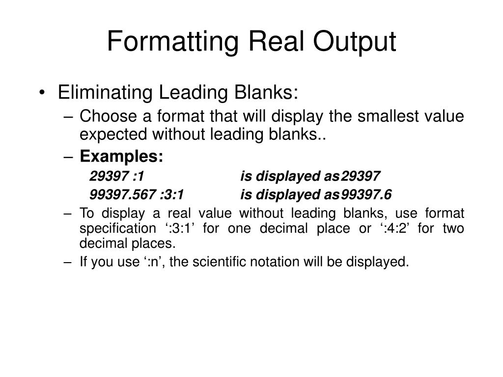 Formatting Real Output • Eliminating Leading Blanks: • Choose a format that will display the smallest value expected without leading blanks.. • Examples: 29397 :1 is displayed as 29397 99397.567 :3:1 is displayed as 99397.6 • To display a real value without leading blanks, use format specification ‘:3:1’ for one decimal place or ‘:4:2’ for two decimal places. • If you use ‘:n’, the scientific notation will be displayed.
