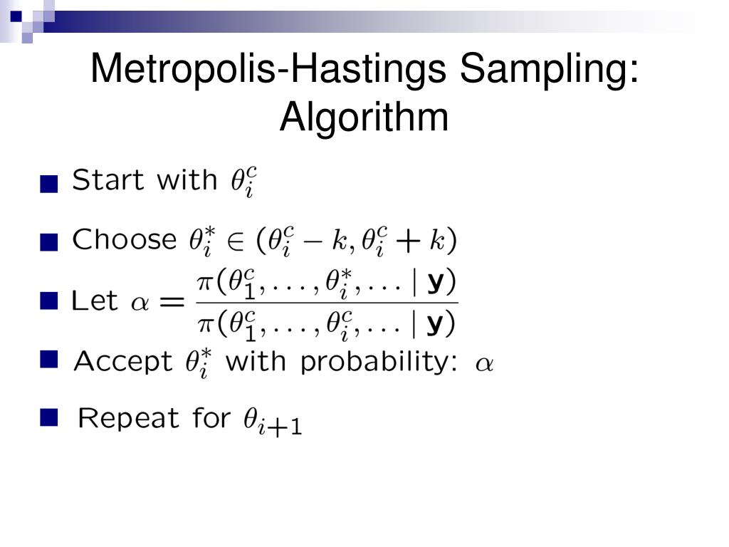 Model Implementation:Markov Chain Monte Carlo • Metropolis-Hastings Sampling: • Gibbs Sampling: