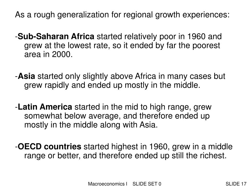 As a rough generalization for regional growth experiences: -Sub-Saharan Africa started relatively poor in 1960 and grew at the lowest rate, so it ended by far the poorest area in 2000. -Asia started only slightly above Africa in many cases but grew rapidly and ended up mostly in the middle. -Latin America started in the mid to high range, grew somewhat below average, and therefore ended up mostly in the middle along with Asia. -OECD countries started highest in 1960, grew in a middle range or better, and therefore ended up still the richest. Macroeconomics I SLIDE SET 0