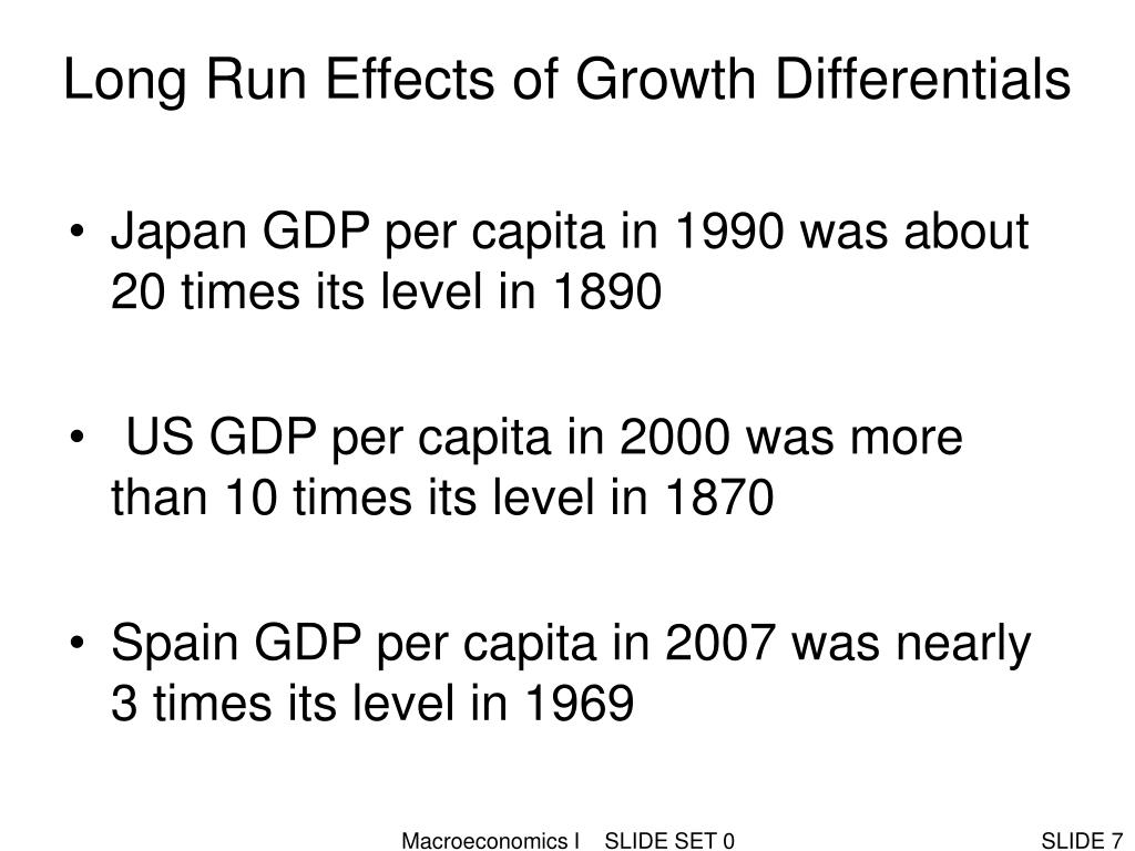 Long Run Effects of Growth Differentials • Japan GDP per capita in 1990 was about 20 times its level in 1890 • US GDP per capita in 2000 was more than 10 times its level in 1870 • Spain GDP per capita in 2007 was nearly 3 times its level in 1969 Macroeconomics I SLIDE SET 0