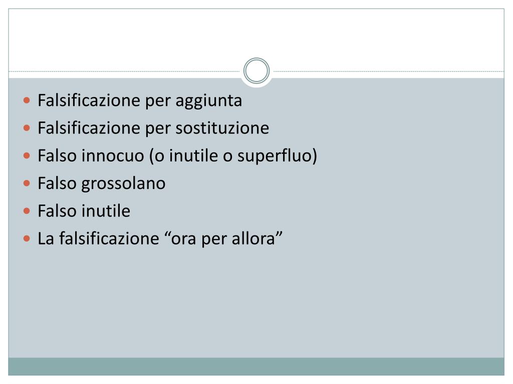 Falsificazione per aggiunta • Falsificazione per sostituzione • Falso innocuo (o inutile o superfluo) • Falso grossolano • Falso inutile • La falsificazione “ora per allora”
