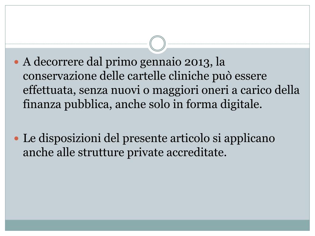 A decorrere dal primo gennaio 2013, la conservazione delle cartelle cliniche può essere effettuata, senza nuovi o maggiori oneri a carico della finanza pubblica, anche solo in forma digitale. • Le disposizioni del presente articolo si applicano anche alle strutture private accreditate.