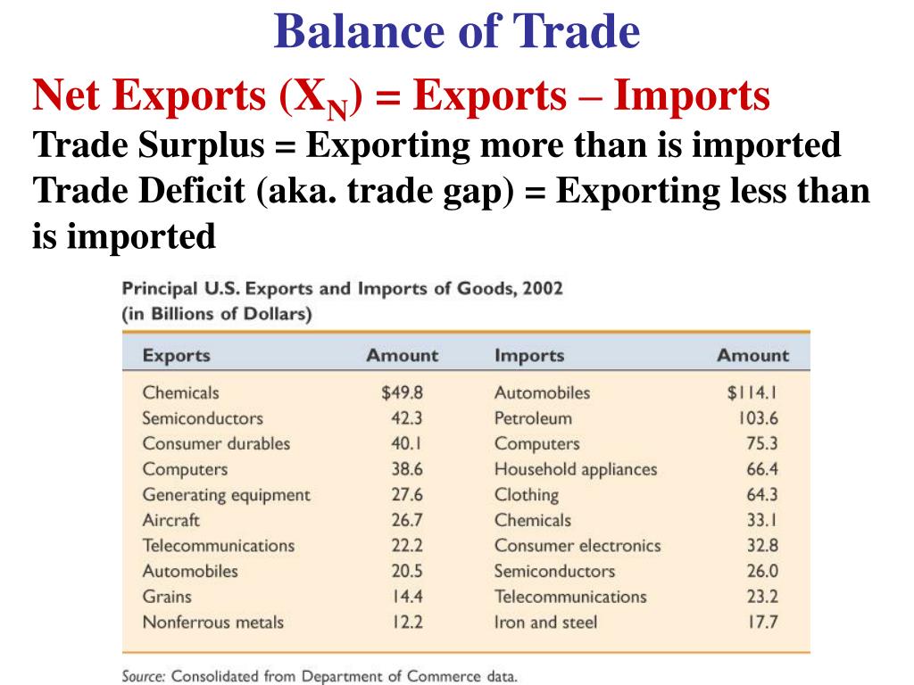 Balance of Trade Net Exports (XN) = Exports – Imports Trade Surplus = Exporting more than is imported Trade Deficit (aka. trade gap) = Exporting less than is imported
