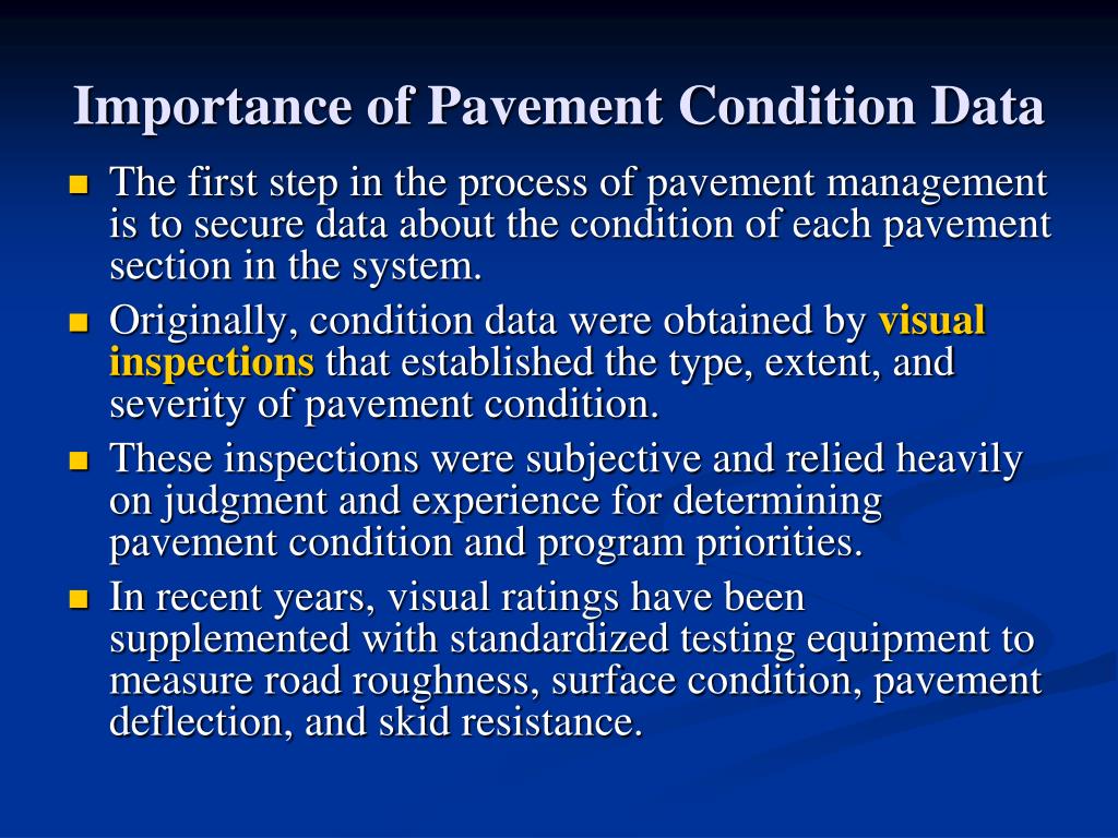 Importance of Pavement Condition Data • The first step in the process of pavement management is to secure data about the condition of each pavement section in the system. • Originally, condition data were obtained by visual inspections that established the type, extent, and severity of pavement condition. • These inspections were subjective and relied heavily on judgment and experience for determining pavement condition and program priorities. • In recent years, visual ratings have been supplemented with standardized testing equipment to measure road roughness, surface condition, pavement deflection, and skid resistance.