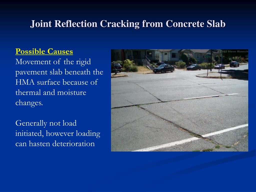 Joint Reflection Cracking from Concrete Slab • Possible Causes • Movement of the rigid pavement slab beneath the HMA surface because of thermal and moisture changes. • Generally not load initiated, however loading can hasten deterioration