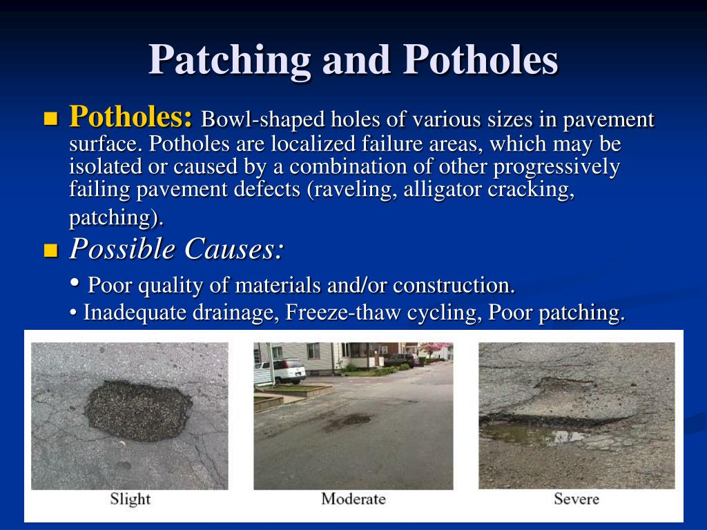 Patching and Potholes • Potholes:Bowl-shaped holes of various sizes in pavement surface. Potholes are localized failure areas, which may be isolated or caused by a combination of other progressively failing pavement defects (raveling, alligator cracking, patching). • Possible Causes: • Poor quality of materials and/or construction. • Inadequate drainage, Freeze-thaw cycling, Poor patching.