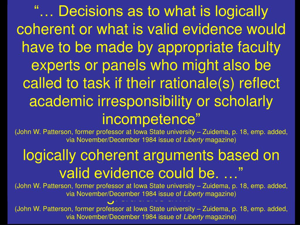 “... In geology and biology, denying the facts of evolution or an earth age in the order of billions of years, would, in my view, be grounds for drastic action. ...Resorting to arguments based on religious commitments, personal inspirations, revelations, and such would not be acceptable defenses; however, logically coherent arguments based on valid evidence could be. …” (John W. Patterson, former professor at Iowa State university – Zuidema, p. 18, emp. added, via November/December 1984 issue of Liberty magazine) “… Decisions as to what is logically coherent or what is valid evidence would have to be made by appropriate faculty experts or panels who might also be called to task if their rationale(s) reflect academic irresponsibility or scholarly incompetence” (John W. Patterson, former professor at Iowa State university – Zuidema, p. 18, emp. added, via November/December 1984 issue of Liberty magazine) “Never cite a religious science source such as ICR, Answers in Genesis, or anything else like that … if the thesis of your paper is anti-evolutionary (akin to arguing against the germ theory of disease or against the atomic theory of matter) you will receive a failing grade.” (“Bias in higher education” – Answersingenesis.org, March 2003) “The central, unifying principle of biology is the theory of evolution. … How can someone who does not accept the most important theory in biology expect to properly practice in a field that is so heavily based on biology?” (Michael L. Dini, associate professor of biology at Texas Tech University, The New York Times, February 3, 2003, Professor’s Snub of Creationists Prompts U. S. Inquiry) “If you set up an appointment to discuss the writing of a letter of recommendation, I will ask you: ‘How do you think the human species originated?’ If you cannot truthfully and forthrightly affirm a scientific answer to this question, then you should not seek my recommendation for admittance to further education in the biomedical sciences.” (Michael L. Dini, associate professor of biology at Texas Tech University, www2.tltc.ttuedu/dini/Personal/letters.htm – From – www.answersingenesis.org/docs2003/0114dini.asp) “I suggest that every professor should reserve the right to fail any student in his class no matter what the grade record indicates, whenever basic misunderstandings of a certain magnitude are discovered. Moreover, I would propose retracting grades and possibly even degrees if such gross misunderstandings are publicly espoused after passing the course, or after being graduated....” (John W. Patterson, former professor at Iowa State university – Zuidema, p. 18, emp. added, via November/December 1984 issue of Liberty magazine) “[Someone who denies evolution] has committed malpractice regarding the method of science … how can someone who denies the theory of evolution – the very pinnacle of modern biological science – ask to be recommended into a scientific profession by a professional scientist?” (Michael L. Dini, associate professor of biology at Texas Tech University, ibid.)