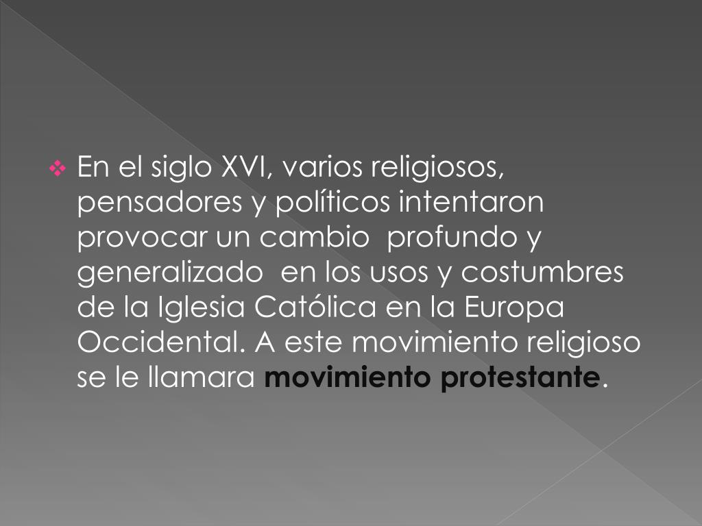 En el siglo XVI, varios religiosos, pensadores y políticos intentaron provocar un cambio profundo y generalizado en los usos y costumbres de la Iglesia Católica en la Europa Occidental. A este movimiento religioso se le llamara movimiento protestante.