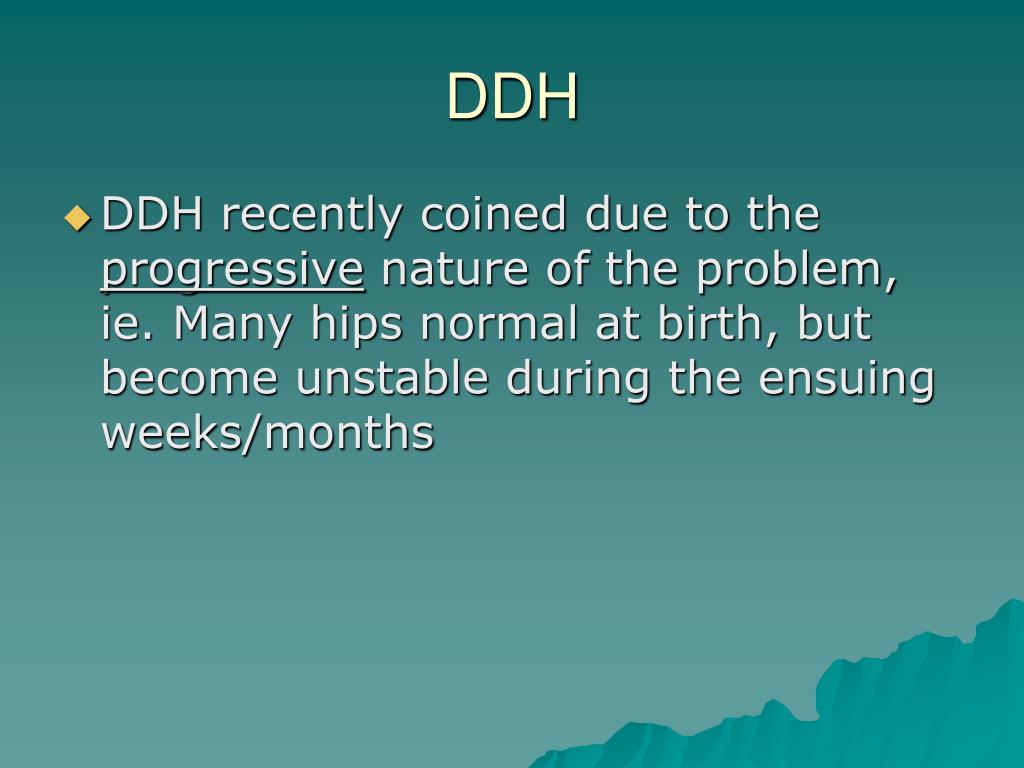 DDH • DDH recently coined due to the progressive nature of the problem, ie. Many hips normal at birth, but become unstable during the ensuing weeks/months