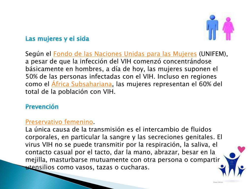 Las mujeres y el sida Según el Fondo de las Naciones Unidas para las Mujeres (UNIFEM), a pesar de que la infección del VIH comenzó concentrándose básicamente en hombres, a día de hoy, las mujeres suponen el 50% de las personas infectadas con el VIH. Incluso en regiones como el África Subsahariana, las mujeres representan el 60% del total de la población con VIH. Prevención Preservativo femenino. La única causa de la transmisión es el intercambio de fluidos corporales, en particular la sangre y las secreciones genitales. El virus VIH no se puede transmitir por la respiración, la saliva, el contacto casual por el tacto, dar la mano, abrazar, besar en la mejilla, masturbarse mutuamente con otra persona o compartir utensilios como vasos, tazas o cucharas.