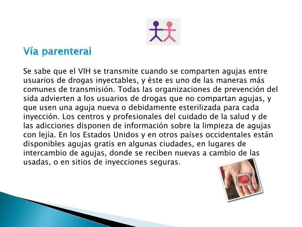 Vía parenteral Se sabe que el VIH se transmite cuando se comparten agujas entre usuarios de drogas inyectables, y éste es uno de las maneras más comunes de transmisión. Todas las organizaciones de prevención del sida advierten a los usuarios de drogas que no compartan agujas, y que usen una aguja nueva o debidamente esterilizada para cada inyección. Los centros y profesionales del cuidado de la salud y de las adicciones disponen de información sobre la limpieza de agujas con lejía. En los Estados Unidos y en otros países occidentales están disponibles agujas gratis en algunas ciudades, en lugares de intercambio de agujas, donde se reciben nuevas a cambio de las usadas, o en sitios de inyecciones seguras.