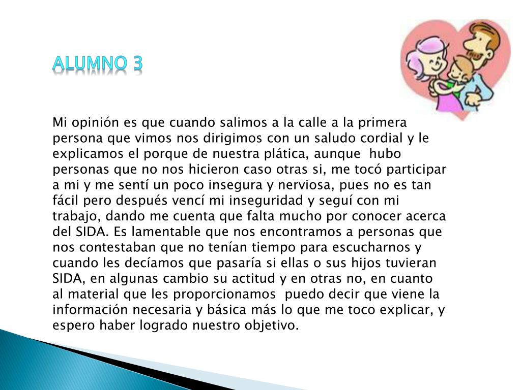 ALUMNO 3 Mi opinión es que cuando salimos a la calle a la primera persona que vimos nos dirigimos con un saludo cordial y le explicamos el porque de nuestra plática, aunque hubo personas que no nos hicieron caso otras si, me tocó participar a mi y me sentí un poco insegura y nerviosa, pues no es tan fácil pero después vencí mi inseguridad y seguí con mi trabajo, dando me cuenta que falta mucho por conocer acerca del SIDA. Es lamentable que nos encontramos a personas que nos contestaban que no tenían tiempo para escucharnos y cuando les decíamos que pasaría si ellas o sus hijos tuvieran SIDA, en algunas cambio su actitud y en otras no, en cuanto al material que les proporcionamos puedo decir que viene la información necesaria y básica más lo que me toco explicar, y espero haber logrado nuestro objetivo.