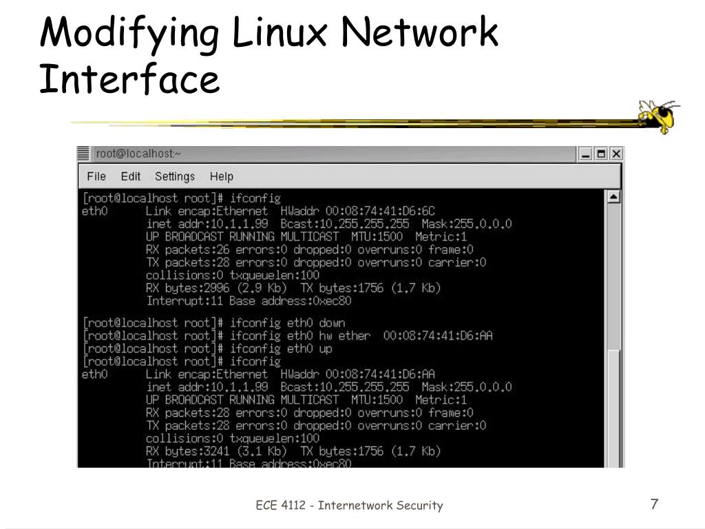 MAC modification/Spoofing • Change the MAC on a Host (Cloning) • Linux (ifconfig) • Windows Network Settings • Creating Link Layer Packets (Spoofing) • libnet (API) • Linkcat (tool – netcat for link layer) ECE 4112 - Internetwork Security