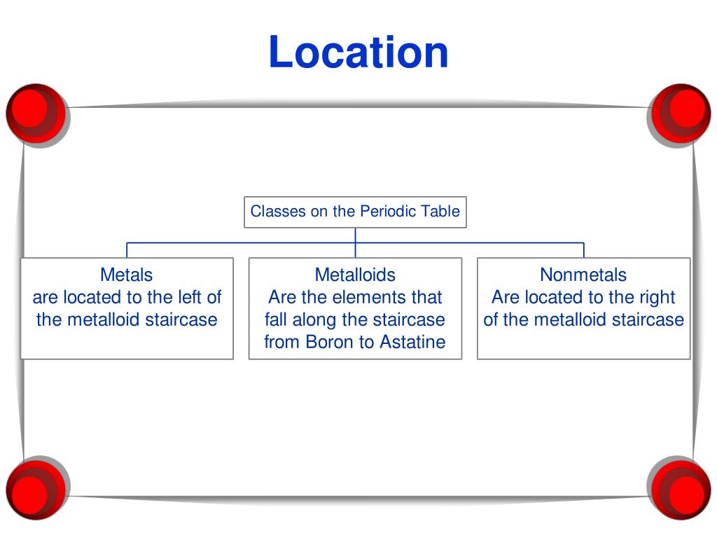 Chapter 5 Objectives • At the end of this section you will be able to… • Explain the shape of the periodic table. • Explain why elements in columns have similar chemical properties. • Determine if an element has metallic, nonmetallic or metalloid properties because of its location on the table. • Label the common families on the table.