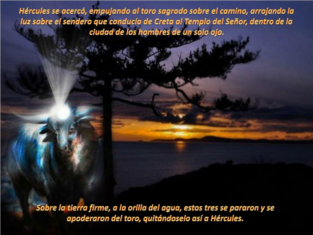 Cruzando el océano hacia la soleada isla ,Hércules emprendió su tarea de buscar y encontrar al toro, y conducirlo al Lugar Sagrado donde moran los hombres de un solo ojo. De un lugar a otro persiguió al toro, guiado por la fulgurante estrella que brillaba sobre la frente del toro, una brillante lámpara en un sitio oscuro.