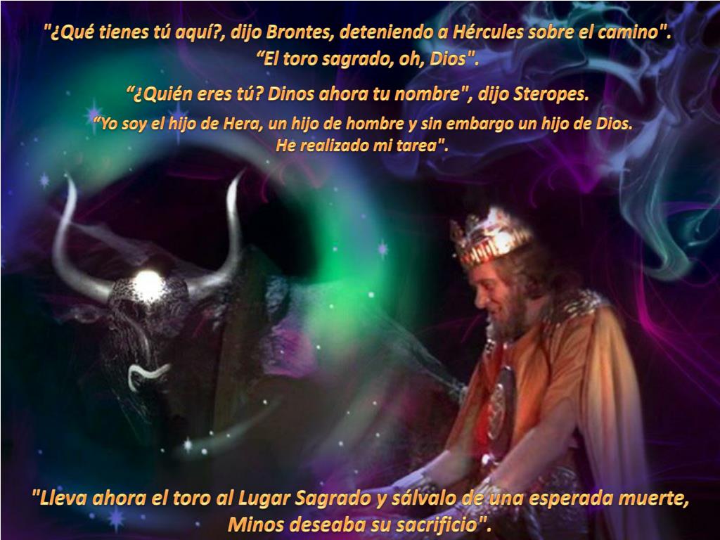 "¿Qué tienes tú aquí?, dijo Brontes, deteniendo a Hércules sobre el camino". “El toro sagrado, oh, Dios". “¿Quién eres tú? Dinos ahora tu nombre", dijo Steropes. “Yo soy el hijo de Hera, un hijo de hombre y sin embargo un hijo de Dios. He realizado mi tarea". "Lleva ahora el toro al Lugar Sagrado y sálvalo de una esperada muerte, Minos deseaba su sacrificio".