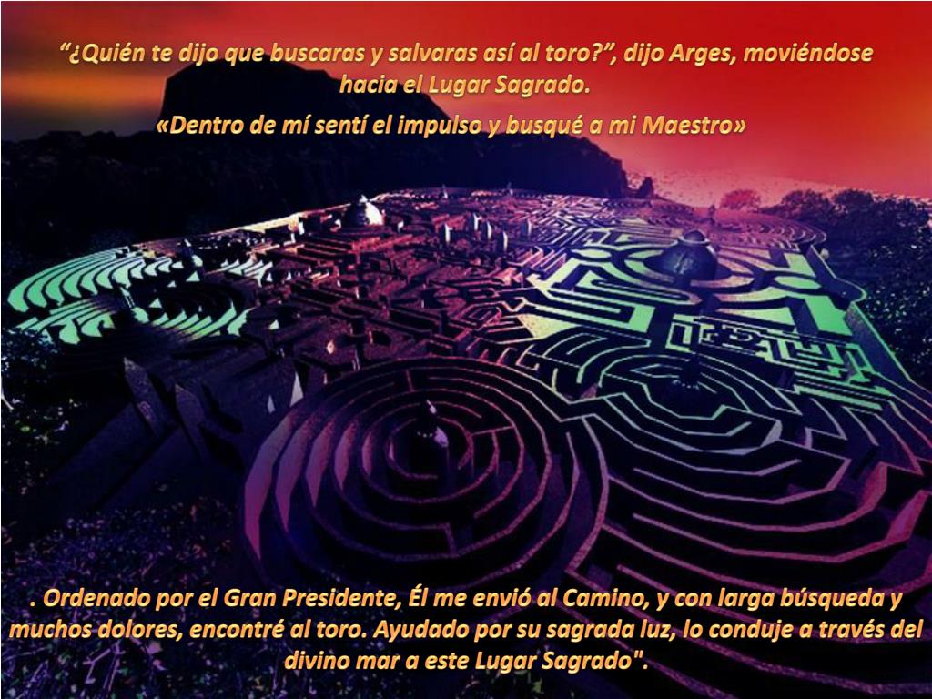 “¿Quién te dijo que buscaras y salvaras así al toro?”, dijo Arges, moviéndose hacia el Lugar Sagrado. «Dentro de mí sentí el impulso y busqué a mi Maestro» . Ordenado por el Gran Presidente, Él me envió al Camino, y con larga búsqueda y muchos dolores, encontré al toro. Ayudado por su sagrada luz, lo conduje a través del divino mar a este Lugar Sagrado".