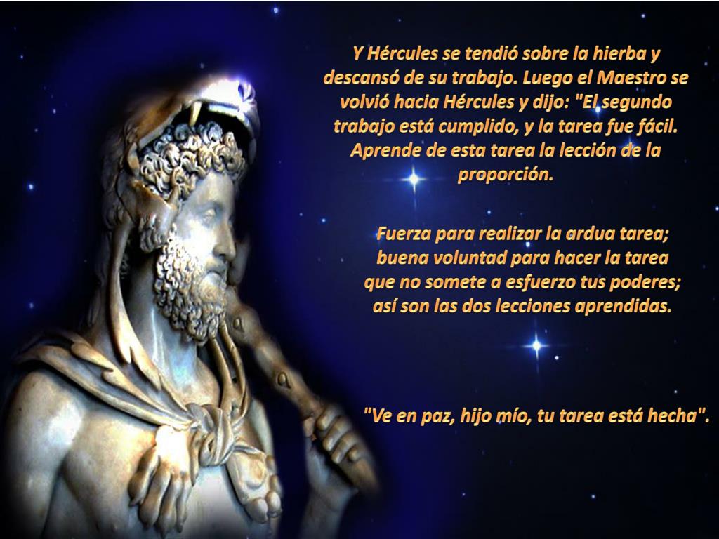 "Viniste con las manos vacías, oh, Hércules", dijo el Maestro. "Tengo estas manos vacías, porque he cumplido la tarea a la cual fui asignado. El toro sagrado está a salvo, en lugar seguro con los Tres. ¿Y ahora qué?” "Dentro de la luz tu verás luz; camina en esa luz y allí ve la luz. Tu luz debe resplandecer más brillante. El toro está en el Lugar Sagrado".