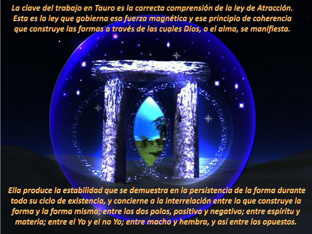 La clave del trabajo en Tauro es la correcta comprensión de la ley de Atracción. Esta es la ley que gobierna esa fuerza magnética y ese principio de coherencia que construye las formas a través de las cuales Dios, o el alma, se manifiesta. Ella produce la estabilidad que se demuestra en la persistencia de la forma durante todo su ciclo de existencia, y concierne a la interrelación entre lo que construye la forma y la forma misma; entre los dos polos, positivo y negativo; entre espíritu y materia; entre el Yo y el no Yo; entre macho y hembra, y así entre los opuestos.