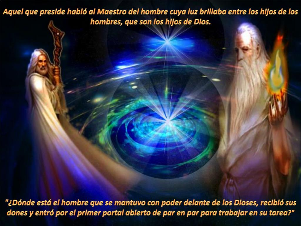 Aquel que preside habló al Maestro del hombre cuya luz brillaba entre los hijos de los hombres, que son los hijos de Dios. "¿Dónde está el hombre que se mantuvo con poder delante de los Dioses, recibió sus dones y entró por el primer portal abierto de par en par para trabajar en su tarea?"