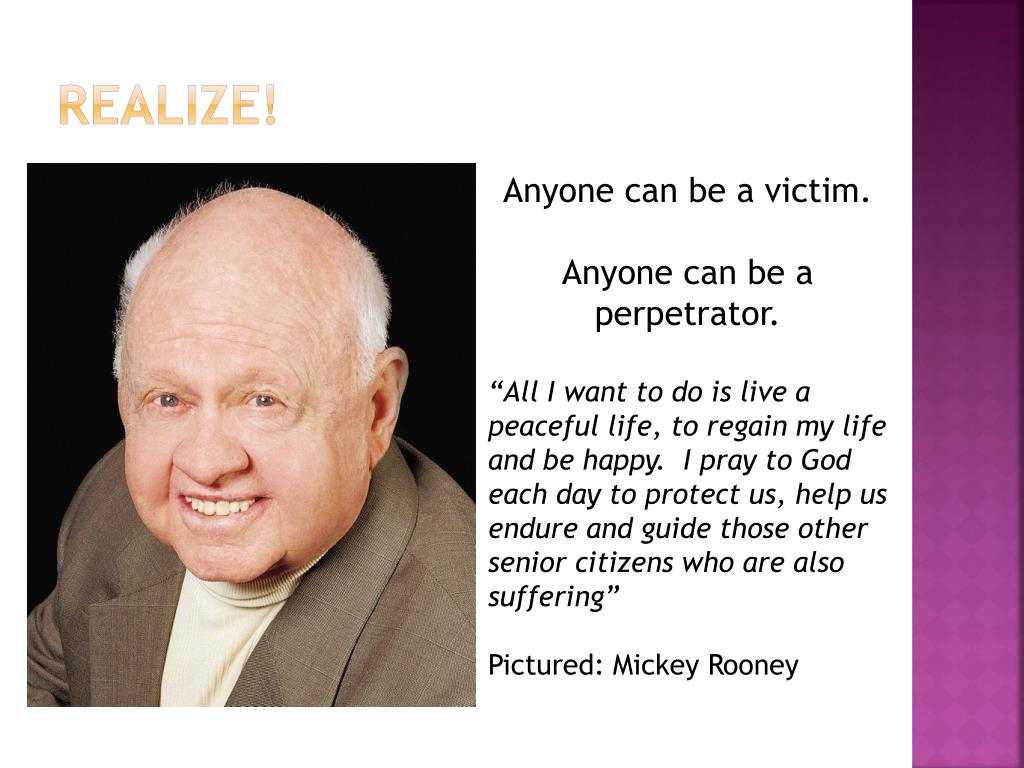 Realize! Anyone can be a victim. Anyone can be a perpetrator. “All I want to do is live a peaceful life, to regain my life and be happy. I pray to God each day to protect us, help us endure and guide those other senior citizens who are also suffering” Pictured: Mickey Rooney