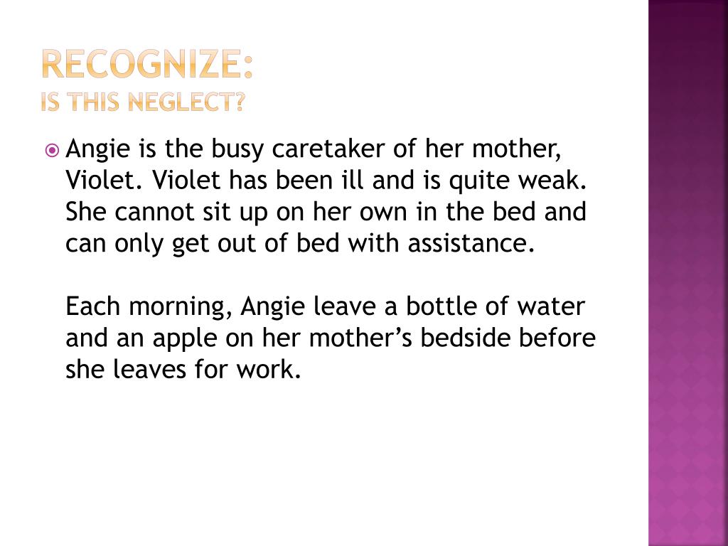 Recognize:is this neglect? • Angie is the busy caretaker of her mother, Violet. Violet has been ill and is quite weak. She cannot sit up on her own in the bed and can only get out of bed with assistance.Each morning, Angie leave a bottle of water and an apple on her mother’s bedside before she leaves for work.