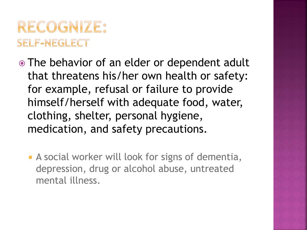Recognize:self-neglect • The behavior of an elder or dependent adult that threatens his/her own health or safety: for example, refusal or failure to provide himself/herself with adequate food, water, clothing, shelter, personal hygiene, medication, and safety precautions. • A social worker will look for signs of dementia, depression, drug or alcohol abuse, untreated mental illness.