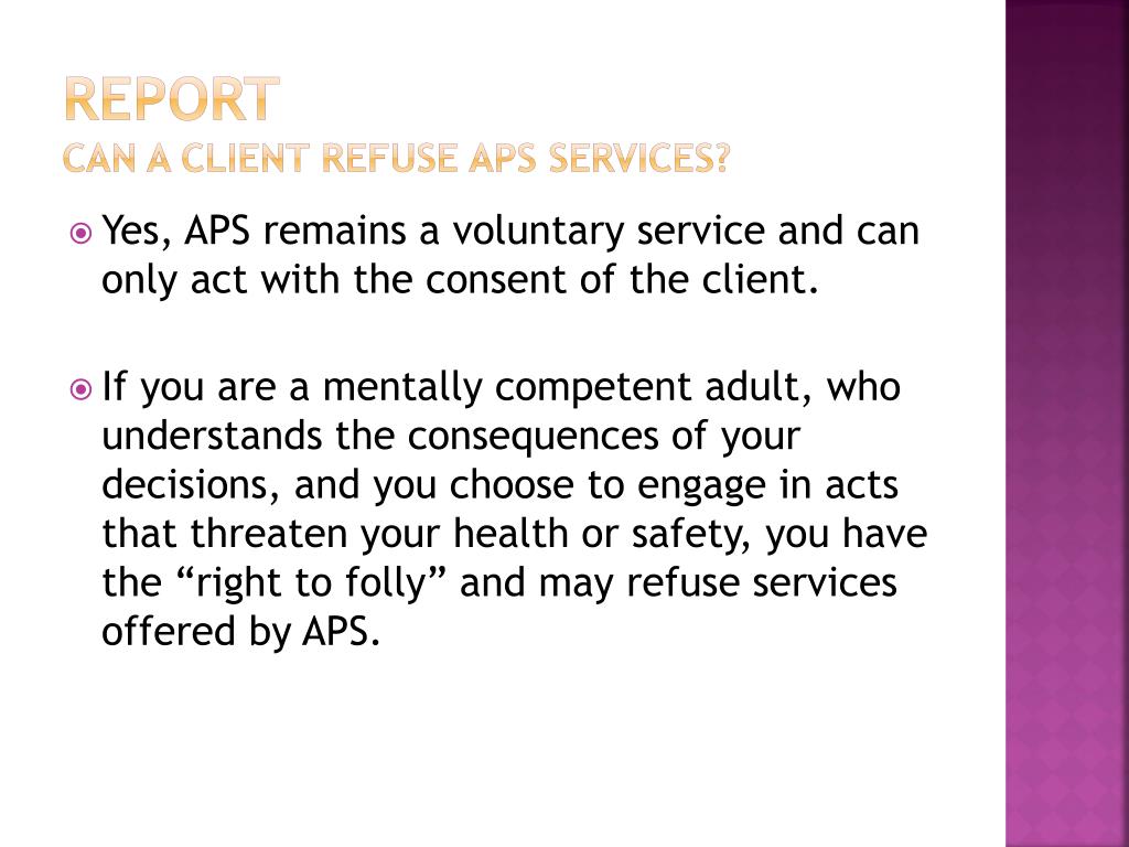 ReportCan a client refuse aps services? • Yes, APS remains a voluntary service and can only act with the consent of the client. • If you are a mentally competent adult, who understands the consequences of your decisions, and you choose to engage in acts that threaten your health or safety, you have the “right to folly” and may refuse services offered by APS.