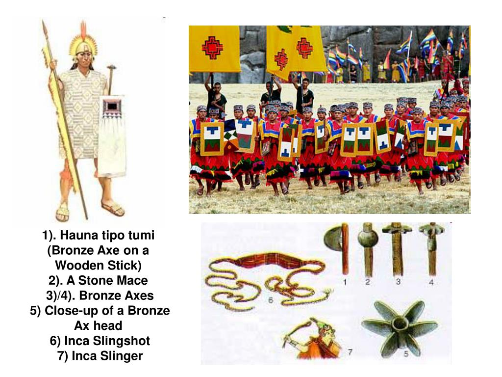 1). Hauna tipo tumi (Bronze Axe on a Wooden Stick) 2). A Stone Mace 3)/4). Bronze Axes 5) Close-up of a Bronze Ax head 6) Inca Slingshot 7) Inca Slinger