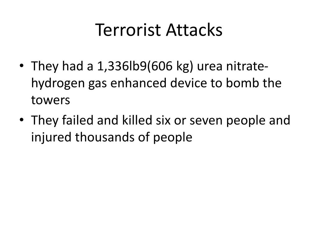 Terrorist Attacks • They had a 1,336lb9(606 kg) urea nitrate-hydrogen gas enhanced device to bomb the towers • They failed and killed six or seven people and injured thousands of people
