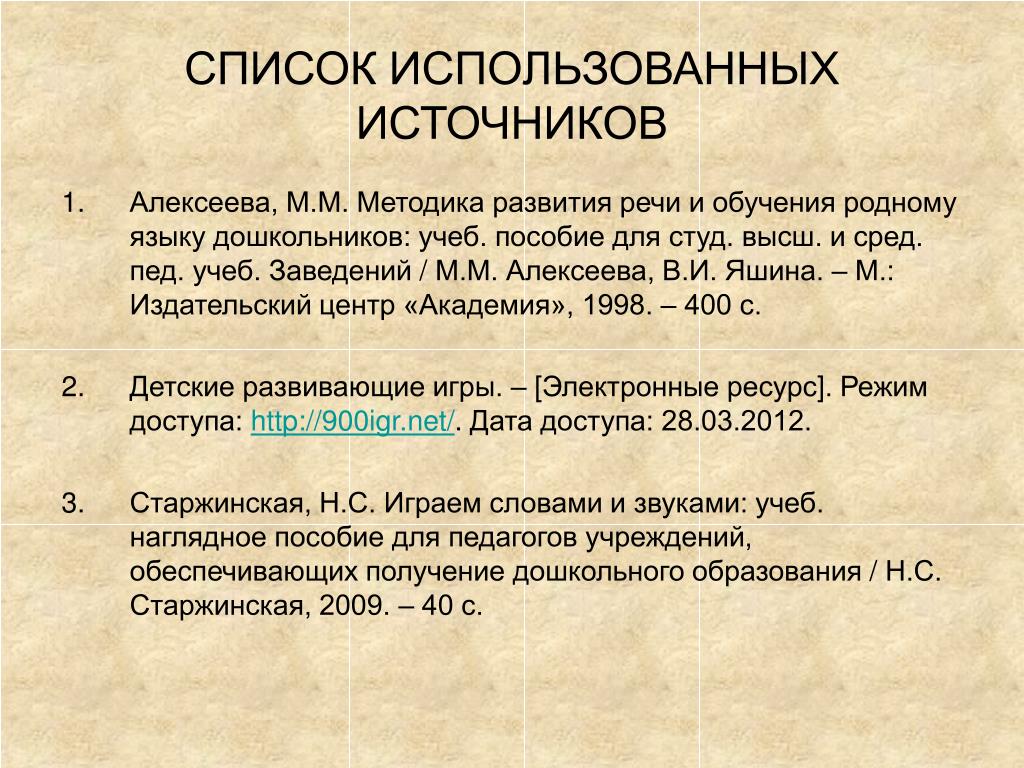 СПИСОК ИСПОЛЬЗОВАННЫХ ИСТОЧНИКОВ • Алексеева, М.М. Методика развития речи и обучения родному языку дошкольников: учеб. пособие для студ. высш. и сред. пед. учеб. Заведений / М.М. Алексеева, В.И. Яшина. – М.: Издательский центр «Академия», 1998. – 400 с. • Детские развивающие игры. – [Электронные ресурс]. Режим доступа: http://900igr.net/. Дата доступа: 28.03.2012. • Старжинская, Н.С. Играем словами и звуками: учеб. наглядное пособие для педагогов учреждений, обеспечивающих получение дошкольного образования / Н.С. Старжинская, 2009. – 40 с.