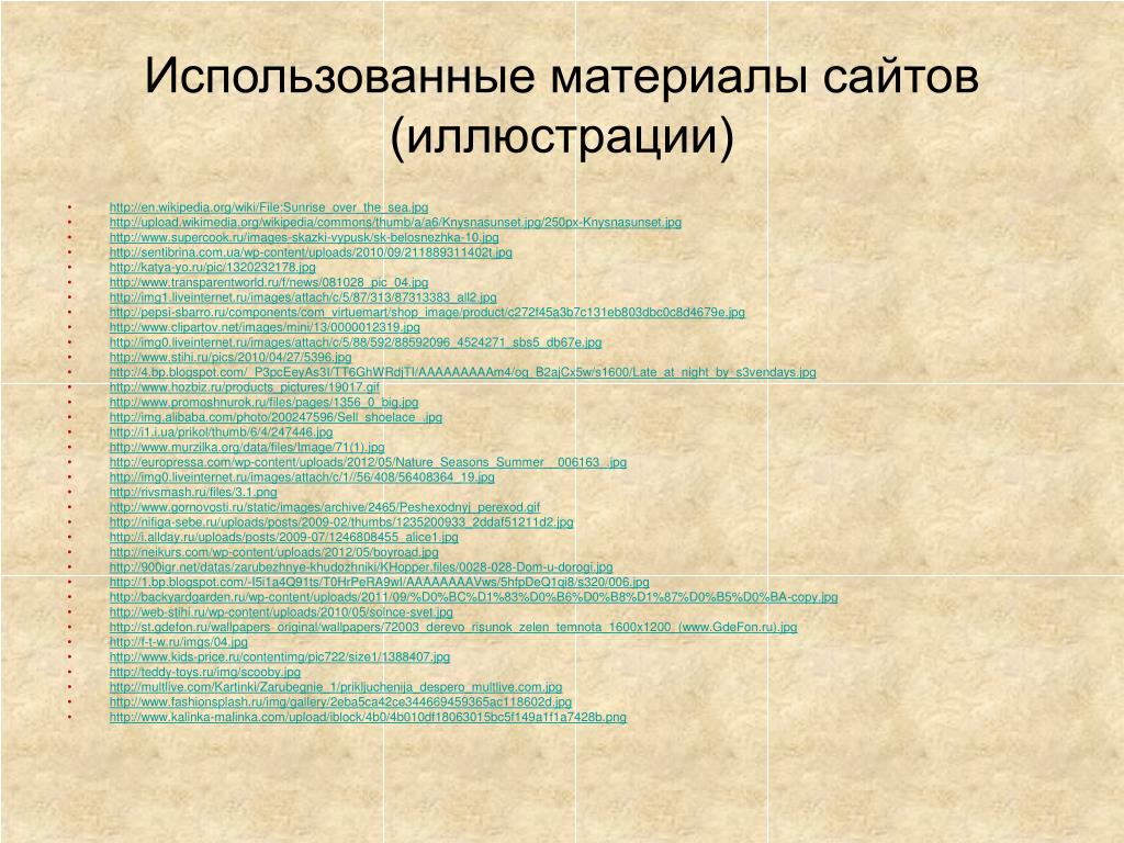 Использованные материалы сайтов (иллюстрации) • http://en.wikipedia.org/wiki/File:Sunrise_over_the_sea.jpg • http://upload.wikimedia.org/wikipedia/commons/thumb/a/a6/Knysnasunset.jpg/250px-Knysnasunset.jpg • http://www.supercook.ru/images-skazki-vypusk/sk-belosnezhka-10.jpg • http://sentibrina.com.ua/wp-content/uploads/2010/09/211889311402t.jpg • http://katya-yo.ru/pic/1320232178.jpg • http://www.transparentworld.ru/f/news/081028_pic_04.jpg • http://img1.liveinternet.ru/images/attach/c/5/87/313/87313383_all2.jpg • http://pepsi-sbarro.ru/components/com_virtuemart/shop_image/product/c272f45a3b7c131eb803dbc0c8d4679e.jpg • http://www.clipartov.net/images/mini/13/0000012319.jpg • http://img0.liveinternet.ru/images/attach/c/5/88/592/88592096_4524271_sbs5_db67e.jpg • http://www.stihi.ru/pics/2010/04/27/5396.jpg • http://4.bp.blogspot.com/_P3pcEeyAs3I/TT6GhWRdjTI/AAAAAAAAAm4/og_B2ajCx5w/s1600/Late_at_night_by_s3vendays.jpg • http://www.hozbiz.ru/products_pictures/19017.gif • http://www.promoshnurok.ru/files/pages/1356_0_big.jpg • http://img.alibaba.com/photo/200247596/Sell_shoelace_.jpg • http://i1.i.ua/prikol/thumb/6/4/247446.jpg • http://www.murzilka.org/data/files/Image/71(1).jpg • http://europressa.com/wp-content/uploads/2012/05/Nature_Seasons_Summer__006163_.jpg • http://img0.liveinternet.ru/images/attach/c/1//56/408/56408364_19.jpg • http://rivsmash.ru/files/3.1.png • http://www.gornovosti.ru/static/images/archive/2465/Peshexodnyj_perexod.gif • http://nifiga-sebe.ru/uploads/posts/2009-02/thumbs/1235200933_2ddaf51211d2.jpg • http://i.allday.ru/uploads/posts/2009-07/1246808455_alice1.jpg • http://neikurs.com/wp-content/uploads/2012/05/boyroad.jpg • http://900igr.net/datas/zarubezhnye-khudozhniki/KHopper.files/0028-028-Dom-u-dorogi.jpg • http://1.bp.blogspot.com/-I5i1a4Q91ts/T0HrPeRA9wI/AAAAAAAAVws/5hfpDeQ1qi8/s320/006.jpg • http://backyardgarden.ru/wp-content/uploads/2011/09/%D0%BC%D1%83%D0%B6%D0%B8%D1%87%D0%B5%D0%BA-copy.jpg • http://web-stihi.ru/wp-content/uploads/2010/05/solnce-svet.jpg • http://st.gdefon.ru/wallpapers_original/wallpapers/72003_derevo_risunok_zelen_temnota_1600x1200_(www.GdeFon.ru).jpg • http://f-t-w.ru/imgs/04.jpg • http://www.kids-price.ru/contentimg/pic722/size1/1388407.jpg • http://teddy-toys.ru/img/scooby.jpg • http://multlive.com/Kartinki/Zarubegnie_1/prikljuchenija_despero_multlive.com.jpg • http://www.fashionsplash.ru/img/gallery/2eba5ca42ce344669459365ac118602d.jpg • http://www.kalinka-malinka.com/upload/iblock/4b0/4b010df18063015bc5f149a1f1a7428b.png