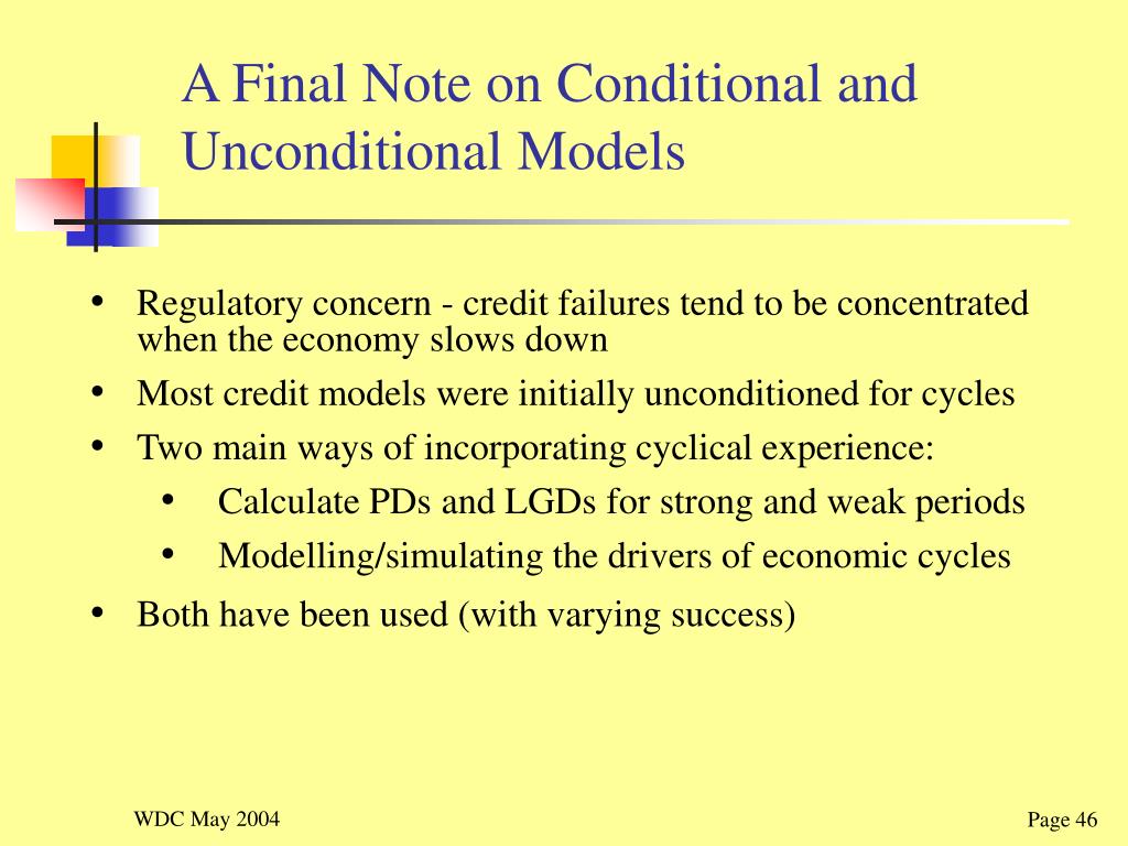 A Final Note on Conditional and Unconditional Models • Regulatory concern - credit failures tend to be concentrated when the economy slows down • Most credit models were initially unconditioned for cycles • Two main ways of incorporating cyclical experience: • Calculate PDs and LGDs for strong and weak periods • Modelling/simulating the drivers of economic cycles • Both have been used (with varying success)